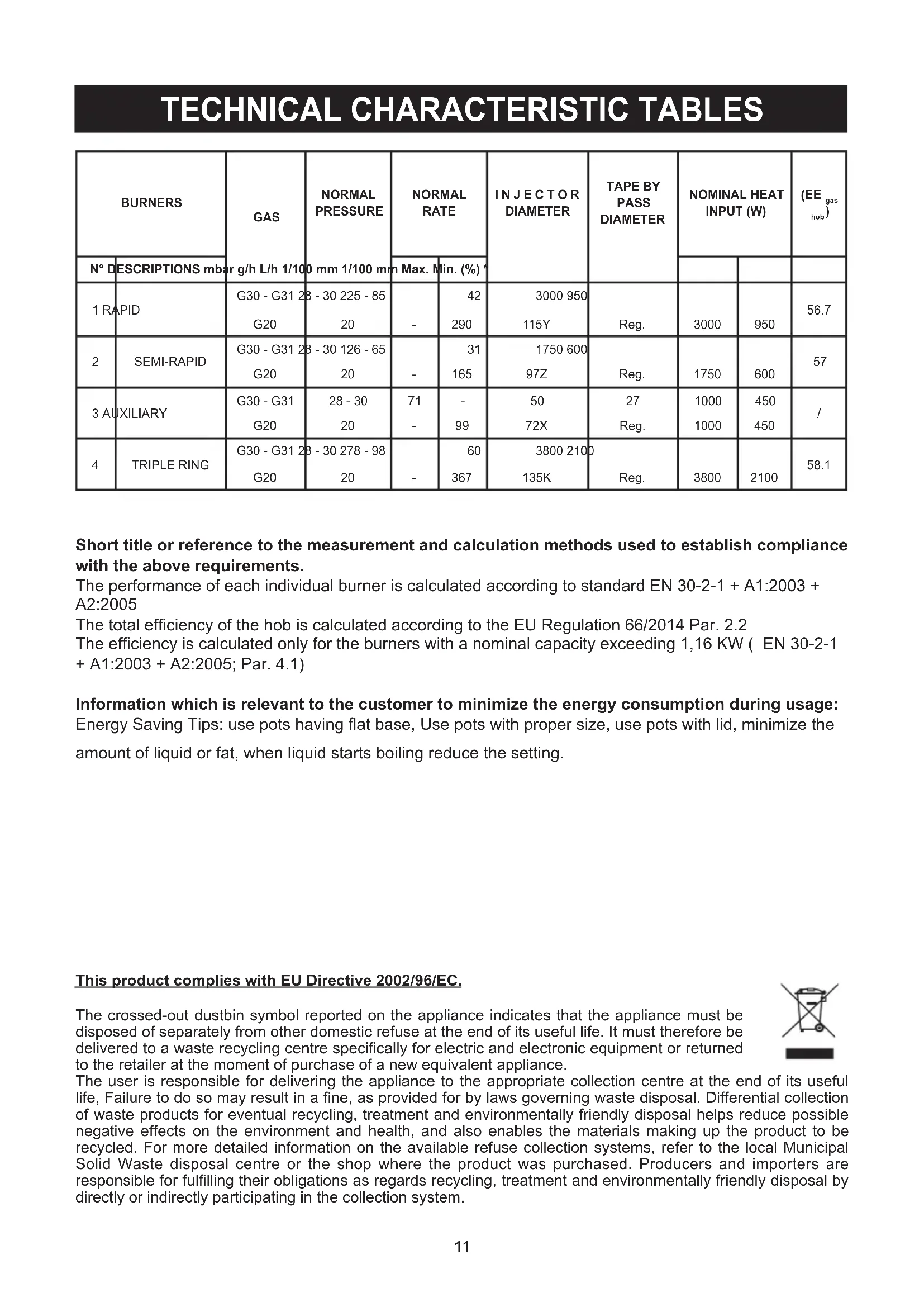 If the appliance is equipped with a glass cover, the latter may shatter if heated. Turn off all the burners and wait a few minutes before closing the cover. The product label, with the serial number, is sticked under the hob. The manufacturer refuses all responsibility for possible damages to things or people, resulting from a wrong installation or from an improper, incorrect or unreasonable use of this equipment.10 1 Rapid burner 3000 W 2 Semi-rapid burner 1750 W 3 Auxiliary burner 1000 W 4 Triple ring burner 3800 W 8 Control knob for burner (EE gas hob = 56.9 %) (EE gas hob = 57.4 %) (EE gas hob = 57.2 %) (EE gas hob = 57.2 %)11