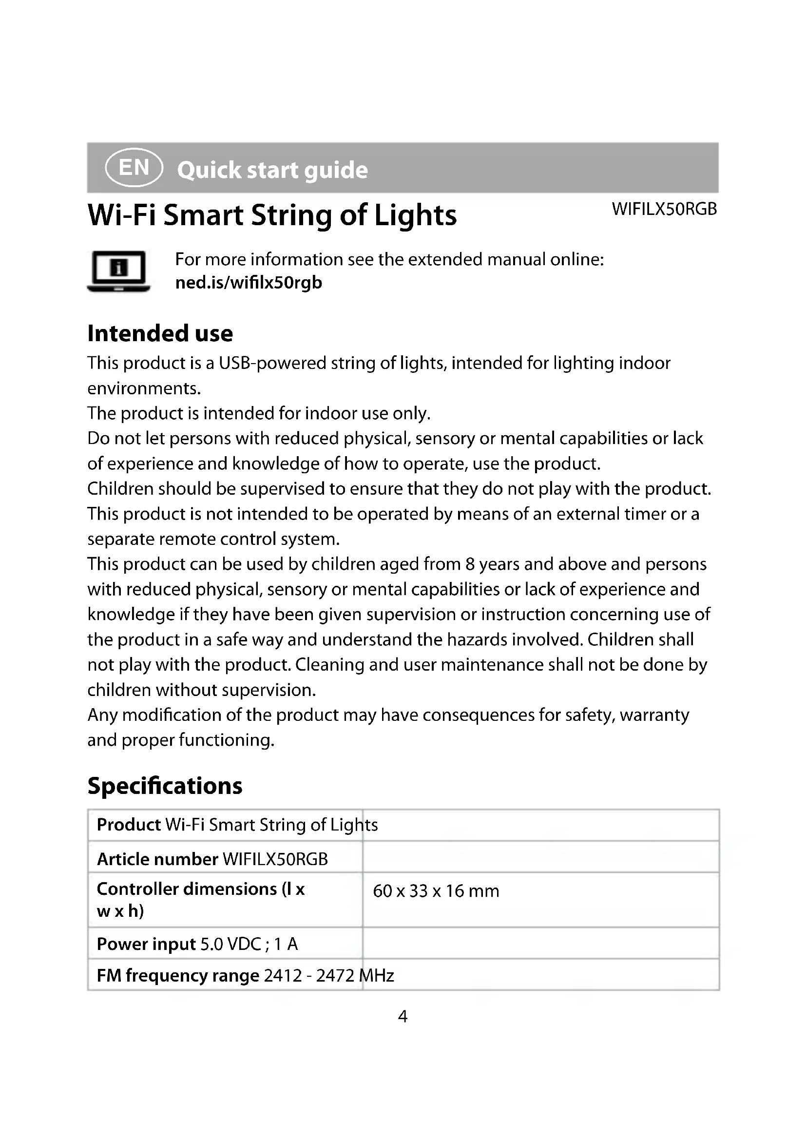 Quick start guide Wi-Fi Smart String of Lights WIFILX50RGB For more information see the extended manual online: ned.is/wilx50rgb Intended use This product is a USB-powered string of lights, intended for lighting indoor environments. The product is intended for indoor use only. Do not let persons with reduced physical, sensory or mental capabilities or lack of experience and knowledge of how to operate, use the product. Children should be supervised to ensure that they do not play with the product. This product is not intended to be operated by means of an external timer or a separate remote control system. This product can be used by children aged from 8 years and above and persons with reduced physical, sensory or mental capabilities or lack of experience and knowledge if they have been given supervision or instruction concerning use of the product in a safe way and understand the hazards involved. Children shall not play with the product. Cleaning and user maintenance shall not be done by children without supervision. Any modication of the product may have consequences for safety, warranty and proper functioning. Specications Product Wi-Fi Smart String of Lights Article number WIFILX50RGB Controller dimensions (l x w x h) 60 x 33 x 16 mm Power input 5.0 VDC ; 1 A FM frequency range 2412 - 2472 MHz5 Maximum transmission power 16 dBm Weight 145g Cable length 100 cm String of lights length 500 cm Main parts (image A) 1 USB power cable 2 Power button 3 Colour button 4 Music button 5 Microphone 6 Control unit 7 LED strip Safety instructions Do not use the product where splashing of water might occur, e.g. bathroom, swimming pool or close to a washbowl.