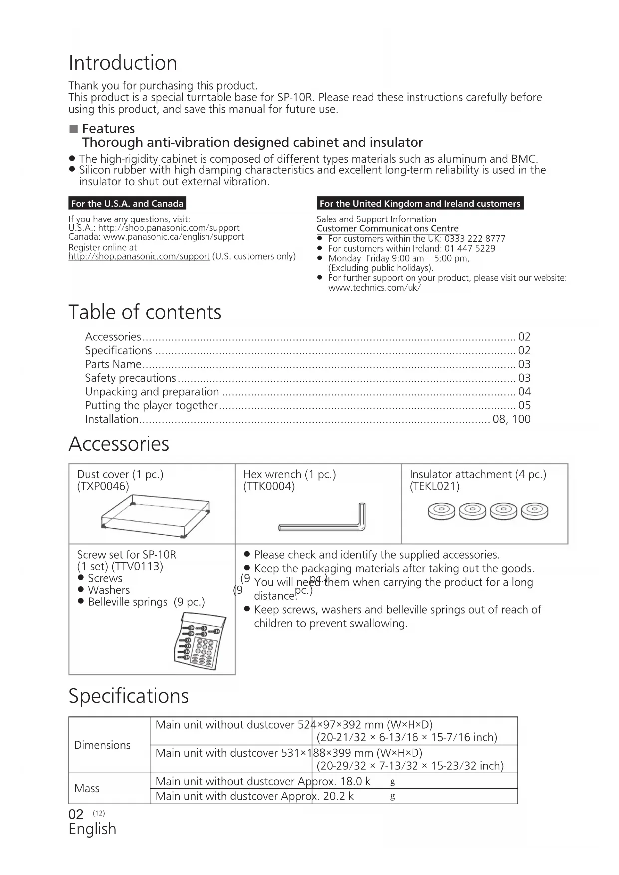 For further support on your product, please visit our website: www.technics.com/uk/For the United Kingdom and Ireland customers Accessories Dust cover (1 pc.) (TXP0046) Hex wrench (1 pc.) (TTK0004) Insulator attachment (4 pc.) (TEKL021) Screw set for SP-10R (1 set)