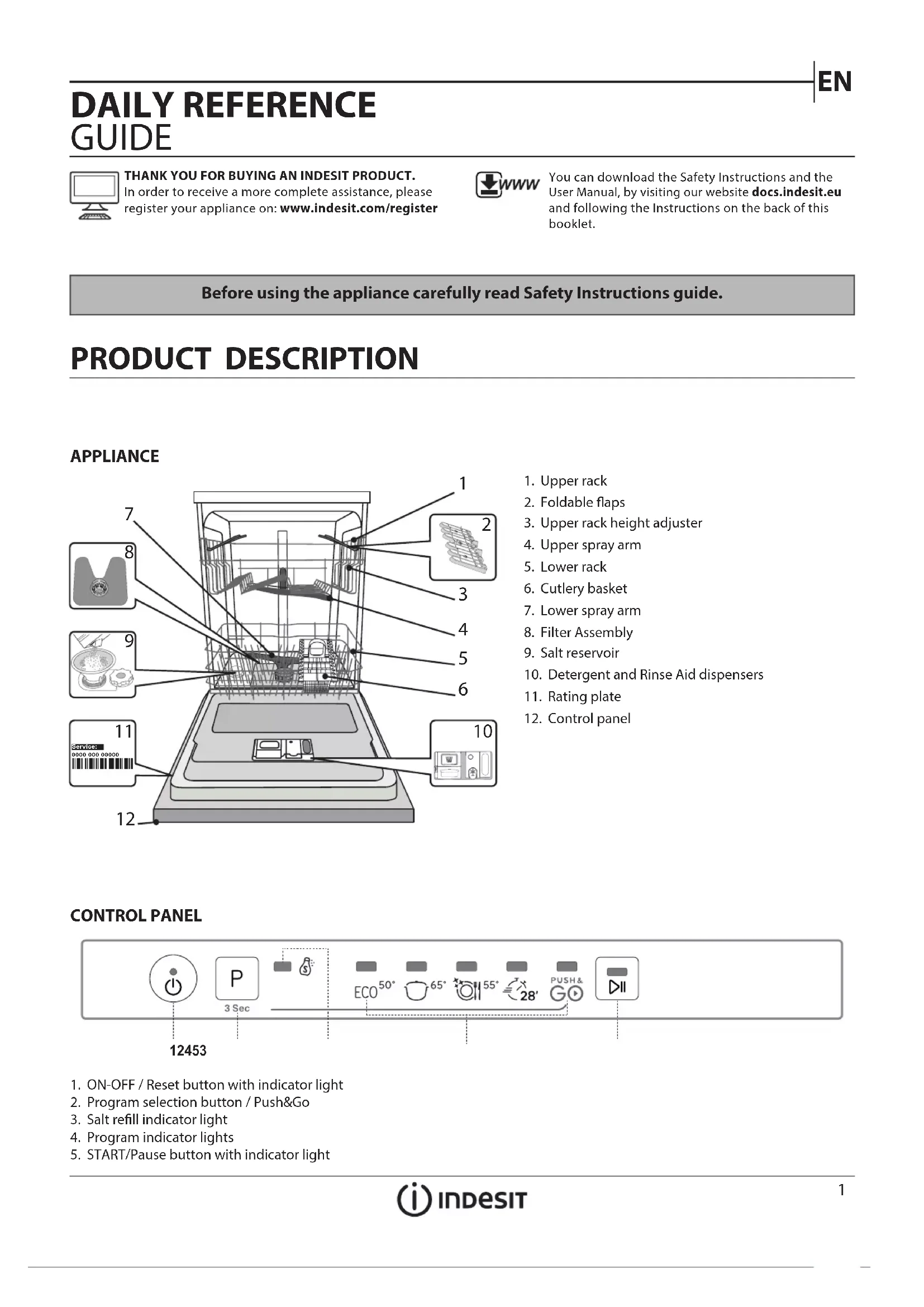Before using the appliance carefully read Safety Instructions guide. APPLIANCE THANK YOU FOR BUYING AN INDESIT PRODUCT. In order to receive a more complete assistance, please register your appliance on: www.indesit.com/registerYou can download the Safety Instructions and the User Manual, by visiting our website docs.indesit.eu and following the Instructions on the back of this booklet.1. Upper rack2. Foldable aps3. Upper rack height adjuster4. Upper spray arm5. Lower rack6. Cutlery basket7. Lower spray arm8. Filter Assembly9. Salt reservoir10. Detergent and Rinse Aid dispensers11. Rating plate12. Control panel1 2 4 531. ON-OFF / Reset button with indicator light2. Program selection button / Push&Go3. Salt rell indicator light4. Program indicator lights5. START/Pause button with indicator light DAILY REFERENCE GUIDE CONTROL PANEL 0000 000 00000 Service: