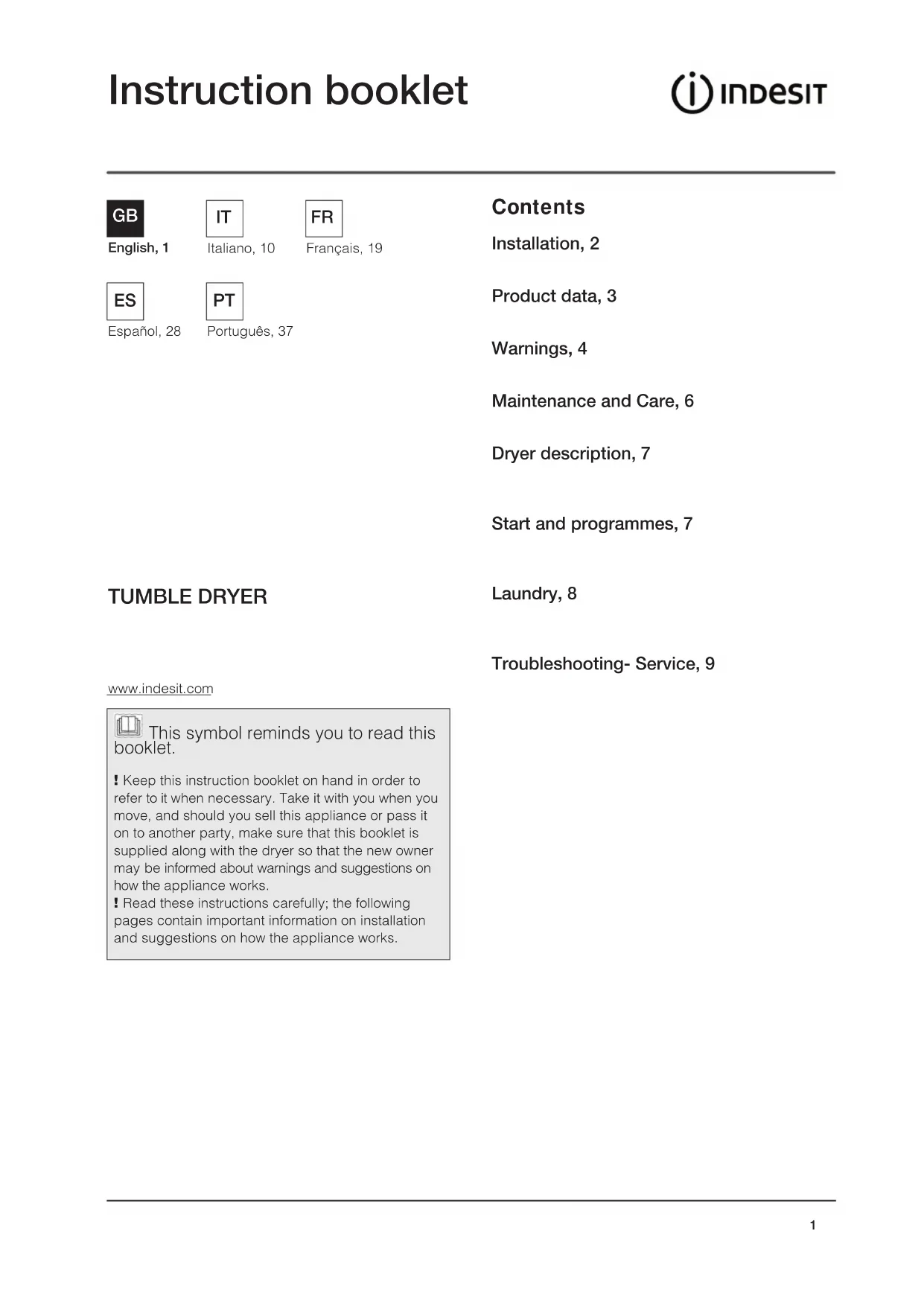 Contents TUMBLE DRYER Instruction booklet Installation, 2 Product data, 3 Warnings, 4 Maintenance and Care, 6 Dryer description, 7 Start and programmes, 7 Laundry, 8 Troubleshooting- Service, 9
