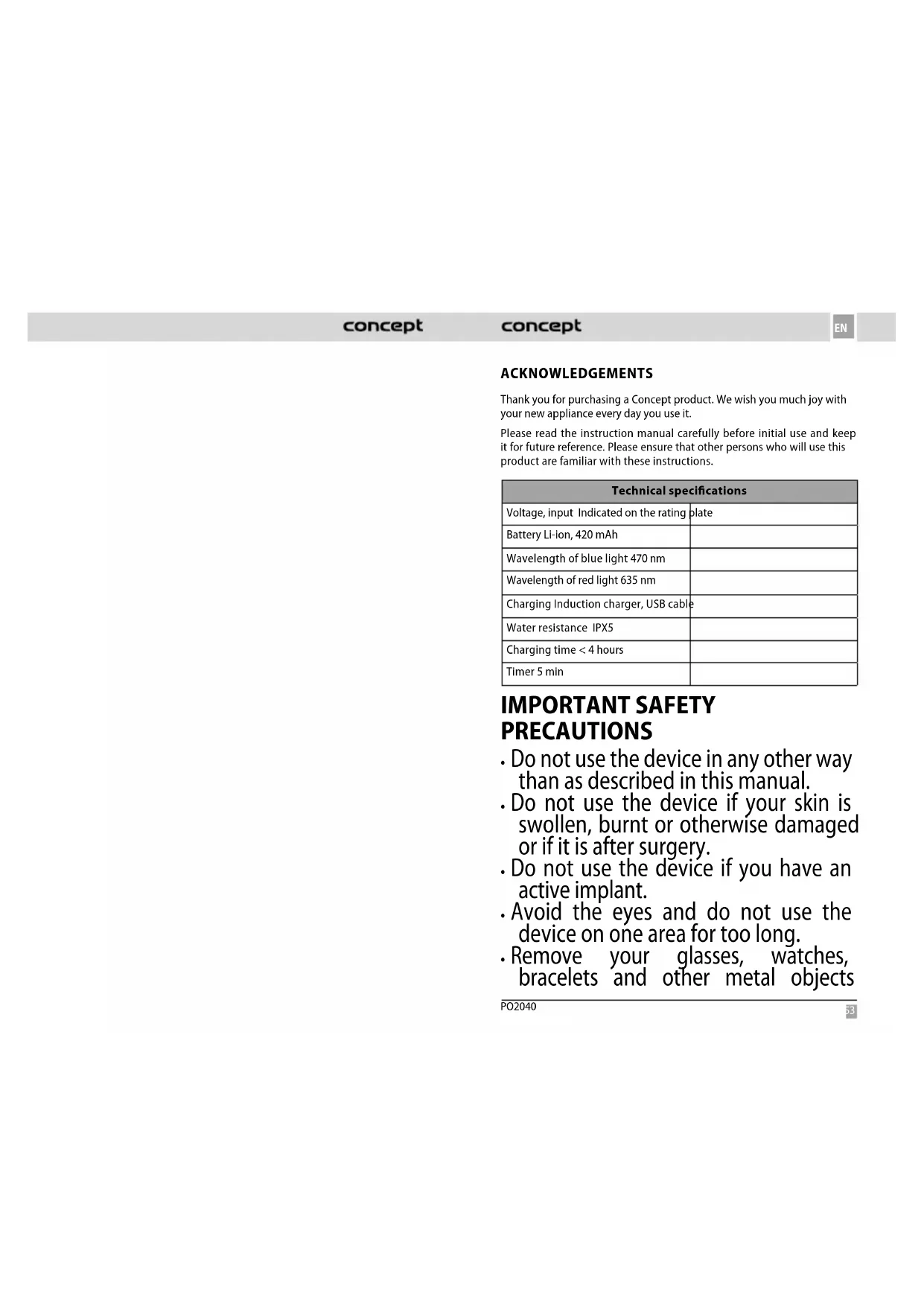 PO2040 ACKNOWLEDGEMENTS Thank you for purchasing a Concept product. We wish you much joy with your new appliance every day you use it. Please read the instruction manual carefully before initial use and keep it for future reference. Please ensure that other persons who will use this product are familiar with these instructions. Technical specifications Voltage, input Indicated on the rating plate Battery Li-ion, 420 mAh Wavelength of blue light 470 nm Wavelength of red light 635 nm Charging Induction charger, USB cable Water resistance IPX5 Charging time < 4 hours Timer 5 min IMPORTANT SAFETY PRECAUTIONS