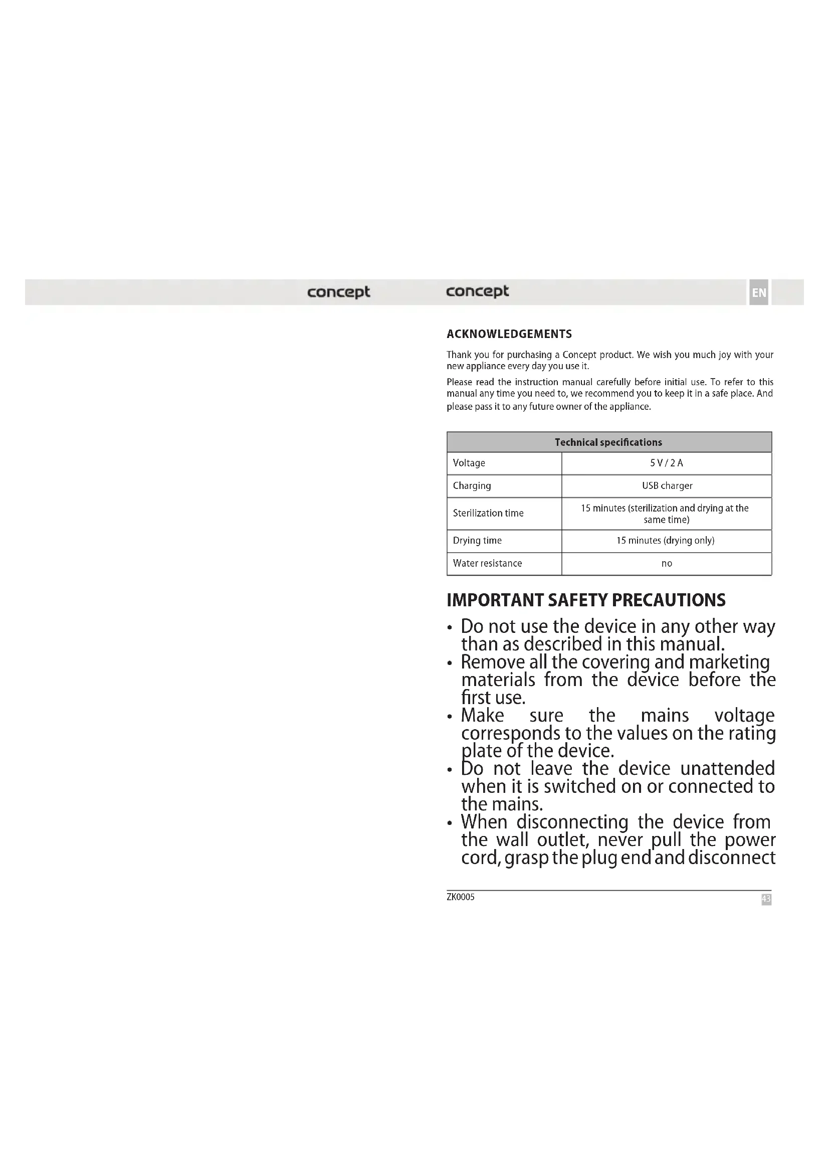 ACKNOWLEDGEMENTS Thank you for purchasing a Concept product. We wish you much joy with your new appliance every day you use it. Please read the instruction manual carefully before initial use. To refer to this manual any time you need to, we recommend you to keep it in a safe place. And please pass it to any future owner of the appliance. Technical specifications Voltage 5 V / 2 A Charging USB charger Sterilization time 15 minutes (sterilization and drying at the same time) Drying time 15 minutes (drying only) Water resistance