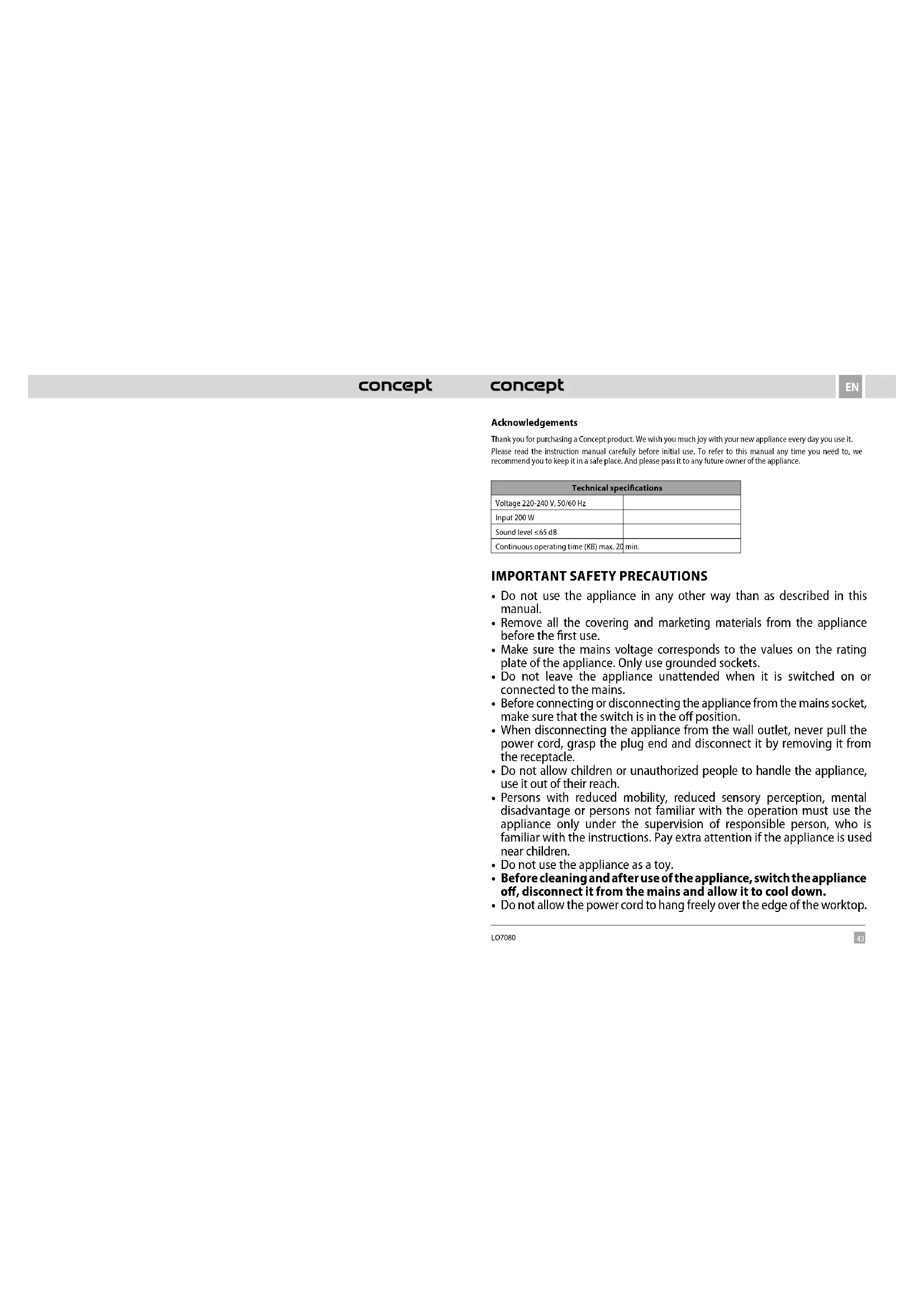 LO7080 Acknowledgements Thank you for purchasing a Concept product. We wish you much joy with your new appliance every day you use it. Please read the instruction manual carefully before initial use. To refer to this manual any time you need to, we recommend you to keep it in a safe place. And please pass it to any future owner of the appliance. Technical specifications Voltage 220-240 V, 50/60 Hz Input 200 W Sound level ≤65 dB Continuous operating time (KB) max. 20 min.