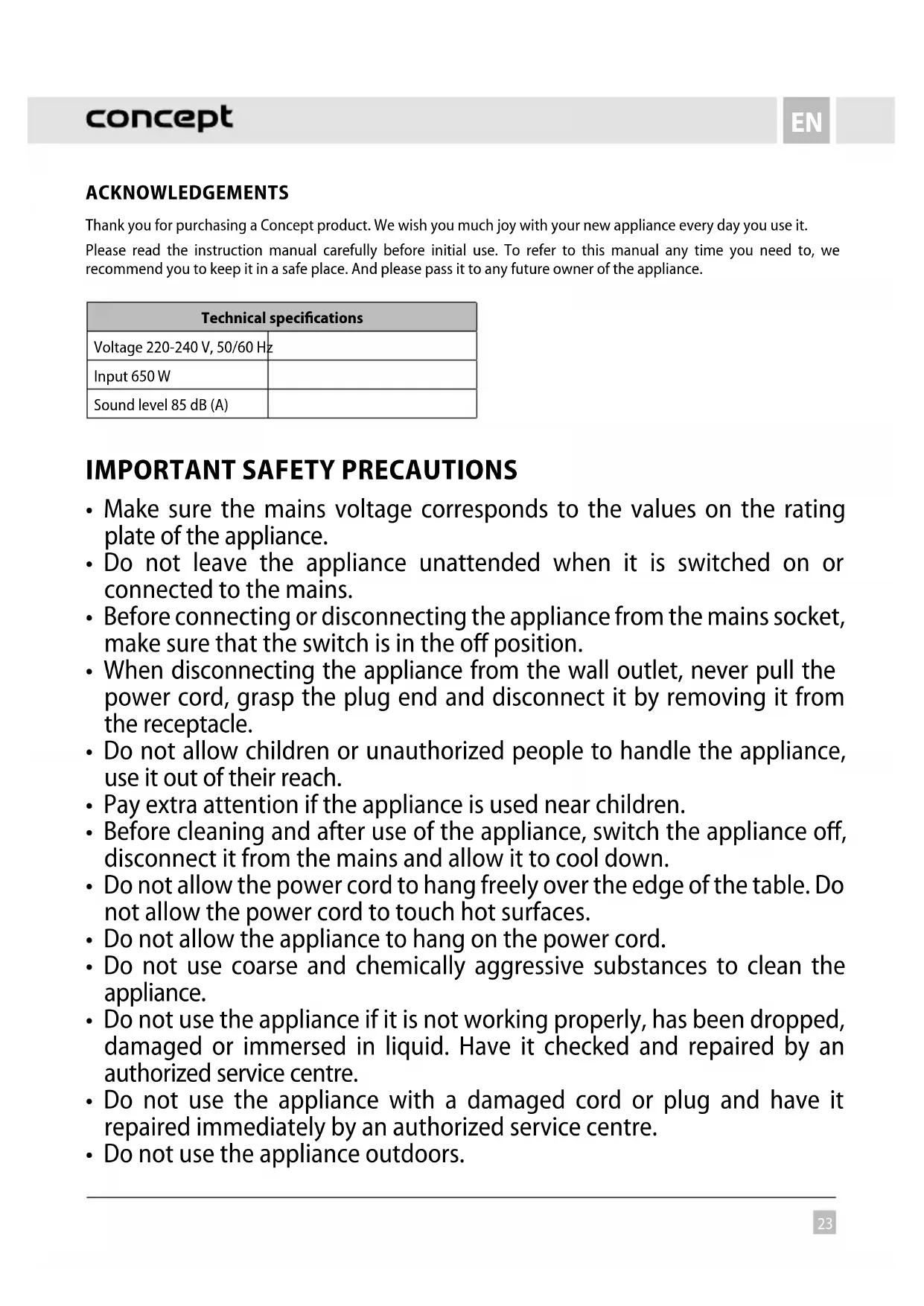 ACKNOWLEDGEMENTS Thank you for purchasing a Concept product. We wish you much joy with your new appliance every day you use it. Please read the instruction manual carefully before initial use. To refer to this manual any time you need to, we recommend you to keep it in a safe place. And please pass it to any future owner of the appliance. Technical specifications Voltage 220-240 V, 50/60 Hz Input 650 W Sound level 85 dB (A)