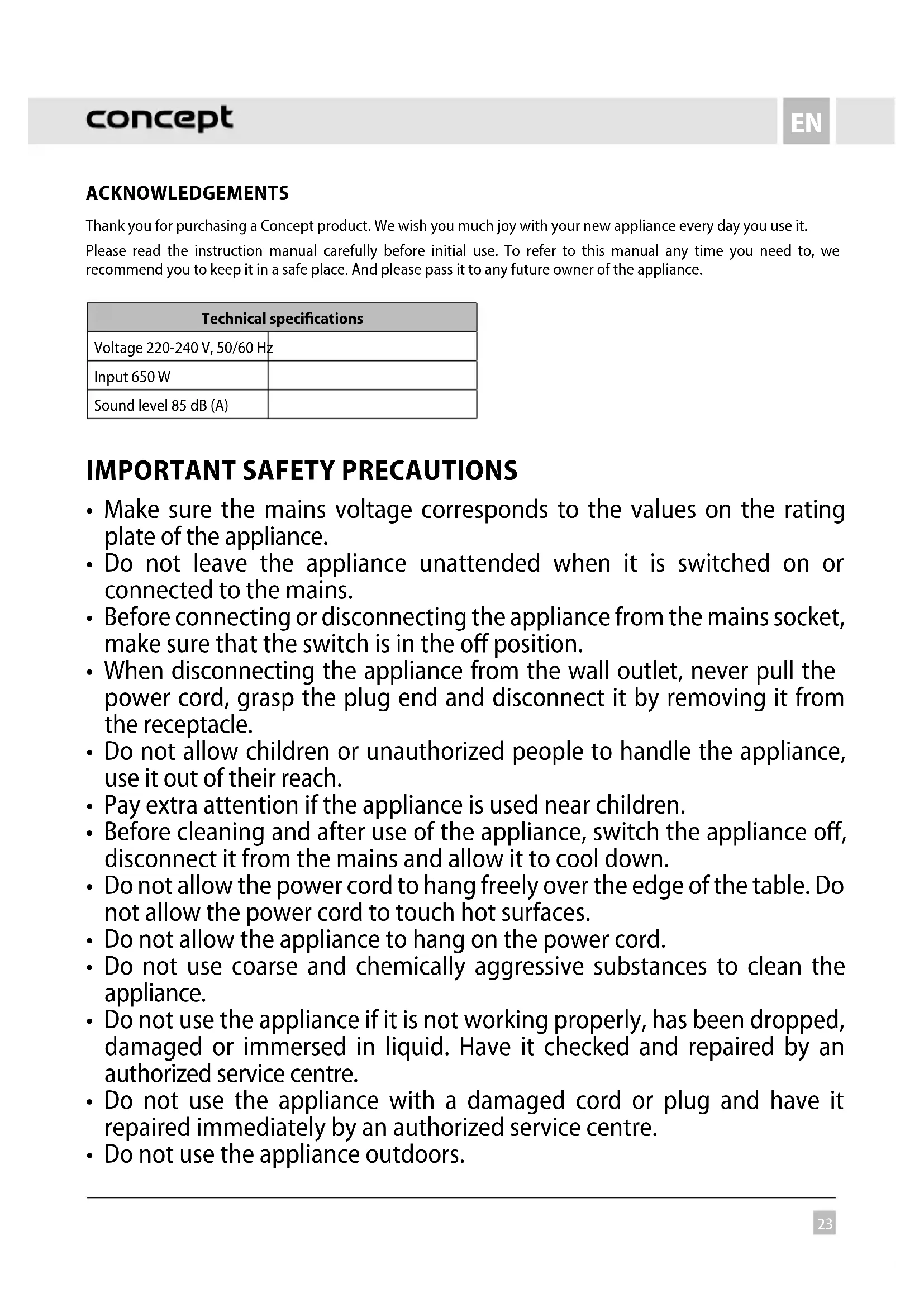 ACKNOWLEDGEMENTS Thank you for purchasing a Concept product. We wish you much joy with your new appliance every day you use it. Please read the instruction manual carefully before initial use. To refer to this manual any time you need to, we recommend you to keep it in a safe place. And please pass it to any future owner of the appliance. Technical specifications Voltage 220-240 V, 50/60 Hz Input 650 W Sound level 85 dB (A)