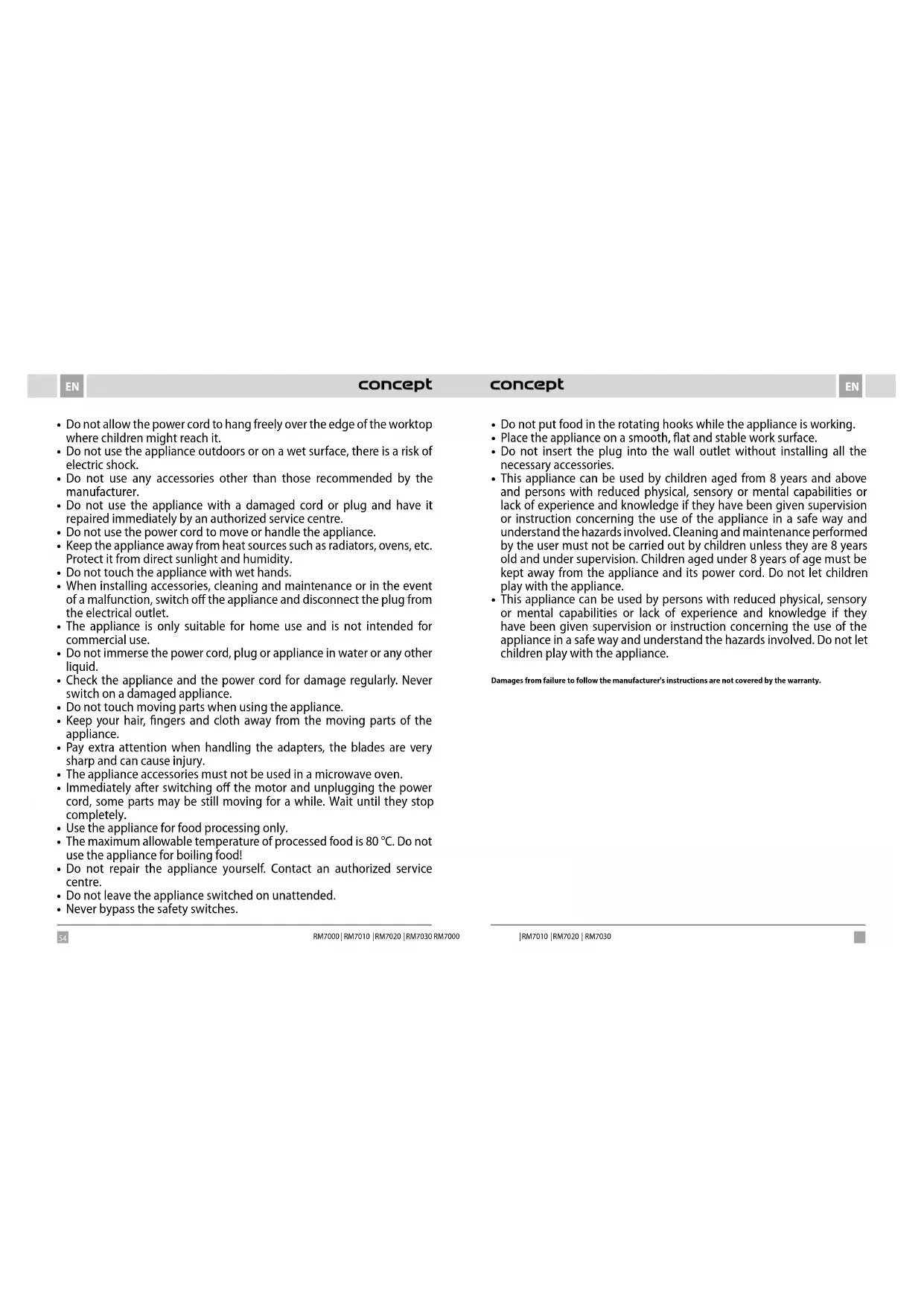 - This appliance can be used by persons with reduced physical, sensory or mental capabilities or lack of experience and knowledge if they have been given supervision or instruction concerning the use of the appliance in a safe way and understand the hazards involved. Do not let children play with the appliance. Damages from failure to follow the manufacturer's instructions are not covered by the warranty.56 57 ENEN RM7000