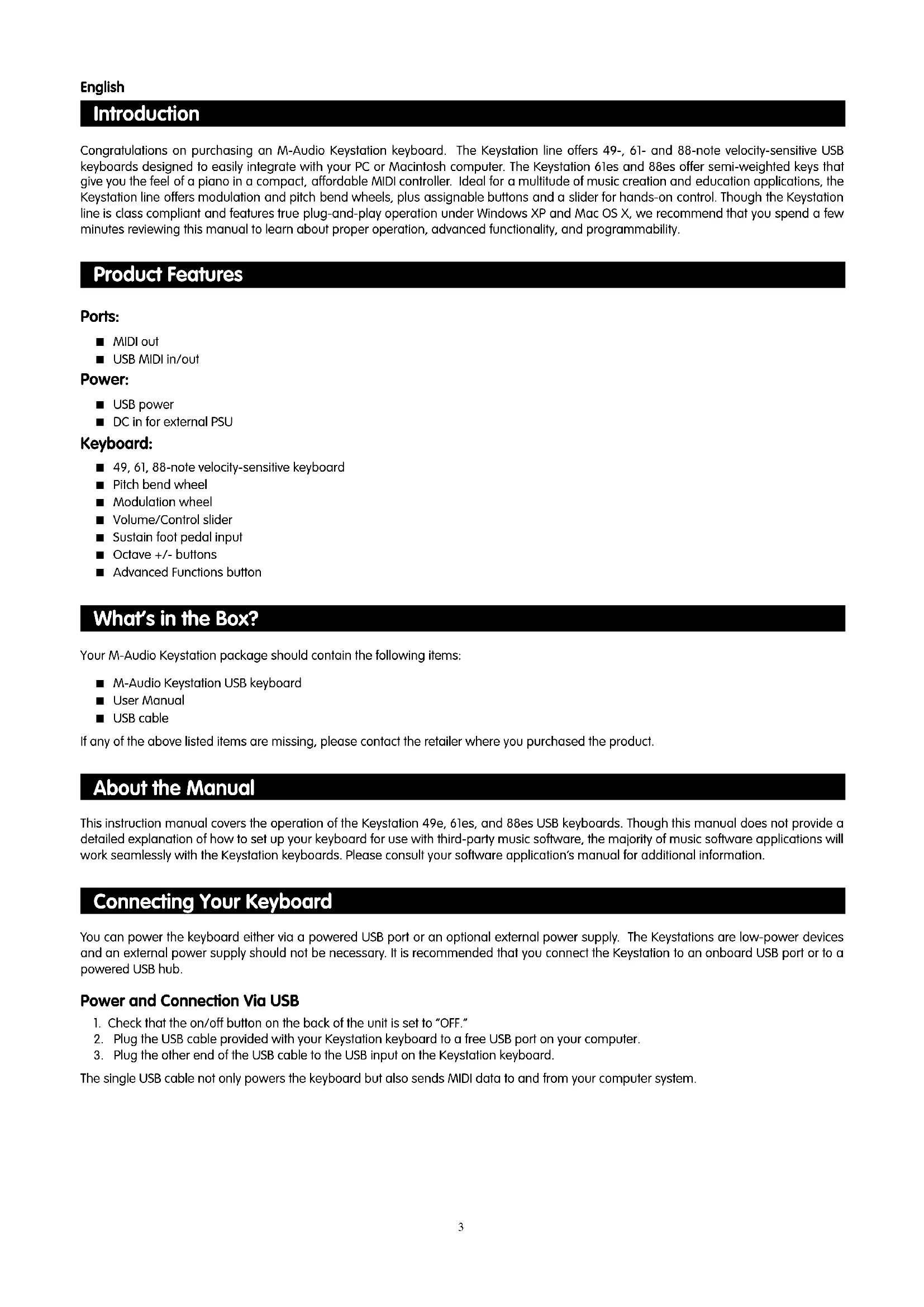 ‒参考MIDIデータ ....................................................................................................................................................................................733 Introduction Congratulations on purchasing an M-Audio Keystation keyboard. The Keystation line offers 49-, 61- and 88-note velocity-sensitive USB keyboards designed to easily integrate with your PC or Macintosh computer. The Keystation 61es and 88es offer semi-weighted keys that give you the feel of a piano in a compact, affordable MIDI controller. Ideal for a multitude of music creation and education applications, the Keystation line offers modulation and pitch bend wheels, plus assignable buttons and a slider for hands-on control. Though the Keystation line is class compliant and features true plug-and-play operation under Windows XP and Mac OS X, we recommend that you spend a few minutes reviewing this manual to learn about proper operation, advanced functionality, and programmability. Product Features Ports: < MIDI out < USB MIDI in/out Power: < USB power < DC in for external PSU Keyboard: < 49, 61, 88-note velocity-sensitive keyboard < Pitch bend wheel < Modulation wheel < Volume/Control slider < Sustain foot pedal input < Octave +/- buttons < Advanced Functions button What’s in the Box? Your M-Audio Keystation package should contain the following items: < M-Audio Keystation USB keyboard < User Manual < USB cable If any of the above listed items are missing, please contact the retailer where you purchased the product. About the Manual This instruction manual covers the operation of the Keystation 49e, 61es, and 88es USB keyboards. Though this manual does not provide a detailed explanation of how to set up your keyboard for use with third-party music software, the majority of music software applications will work seamlessly with the Keystation keyboards. Please consult your software application’s manual for additional information. Connecting Your Keyboard You can power the keyboard either via a powered USB port or an optional external power supply. The Keystations are low-power devices and an external power supply should not be necessary. It is recommended that you connect the Keystation to an onboard USB port or to a powered USB hub. Power and Connection Via USB