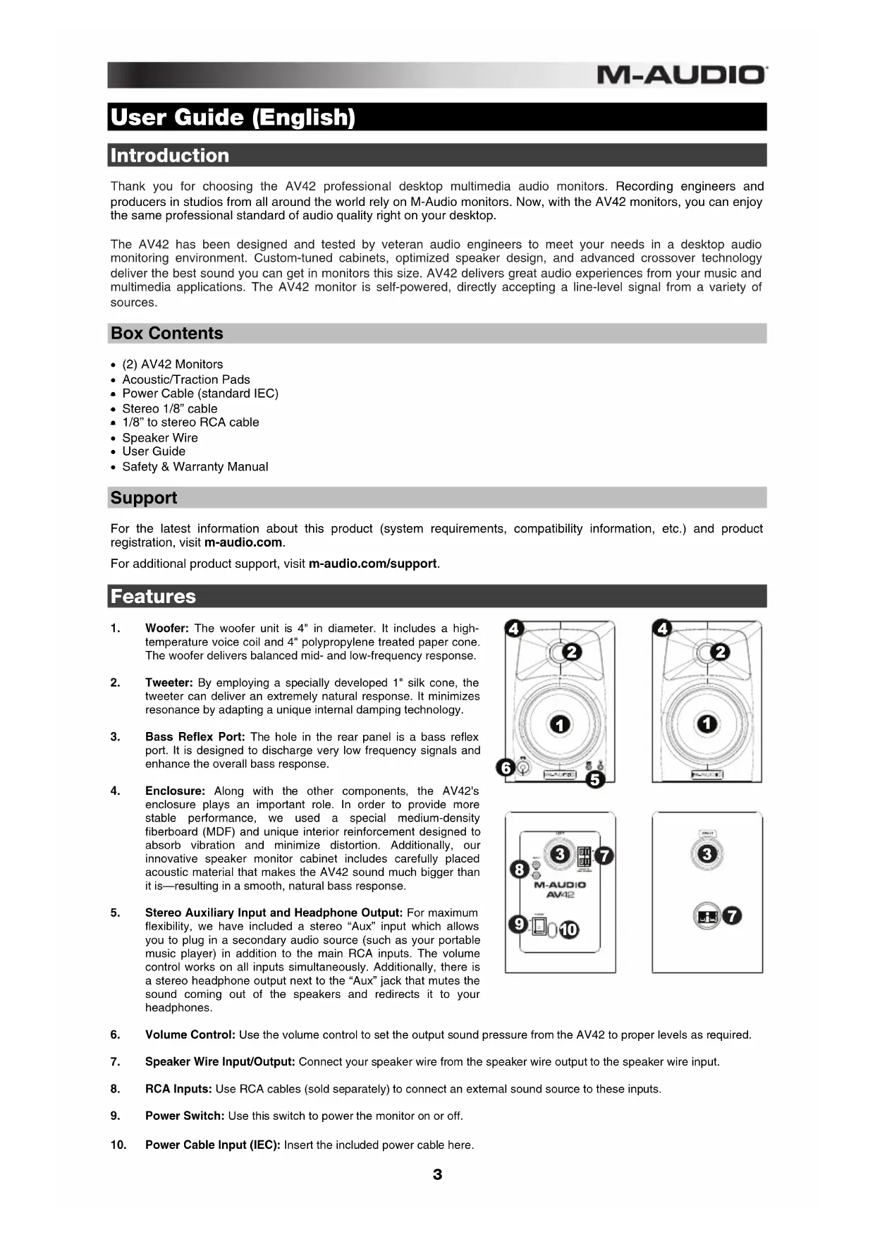 - (2) AV42 Monitors • Acoustic/Traction Pads • Power Cable (standard IEC) • Stereo 1/8” cable • 1/8” to stereo RCA cable • Speaker Wire • User Guide • Safety & Warranty Manual Support For the latest information about this product (system requirements, compatibility information, etc.) and product registration, visit m-audio.com. For additional product support, visit m-audio.com/support. Features