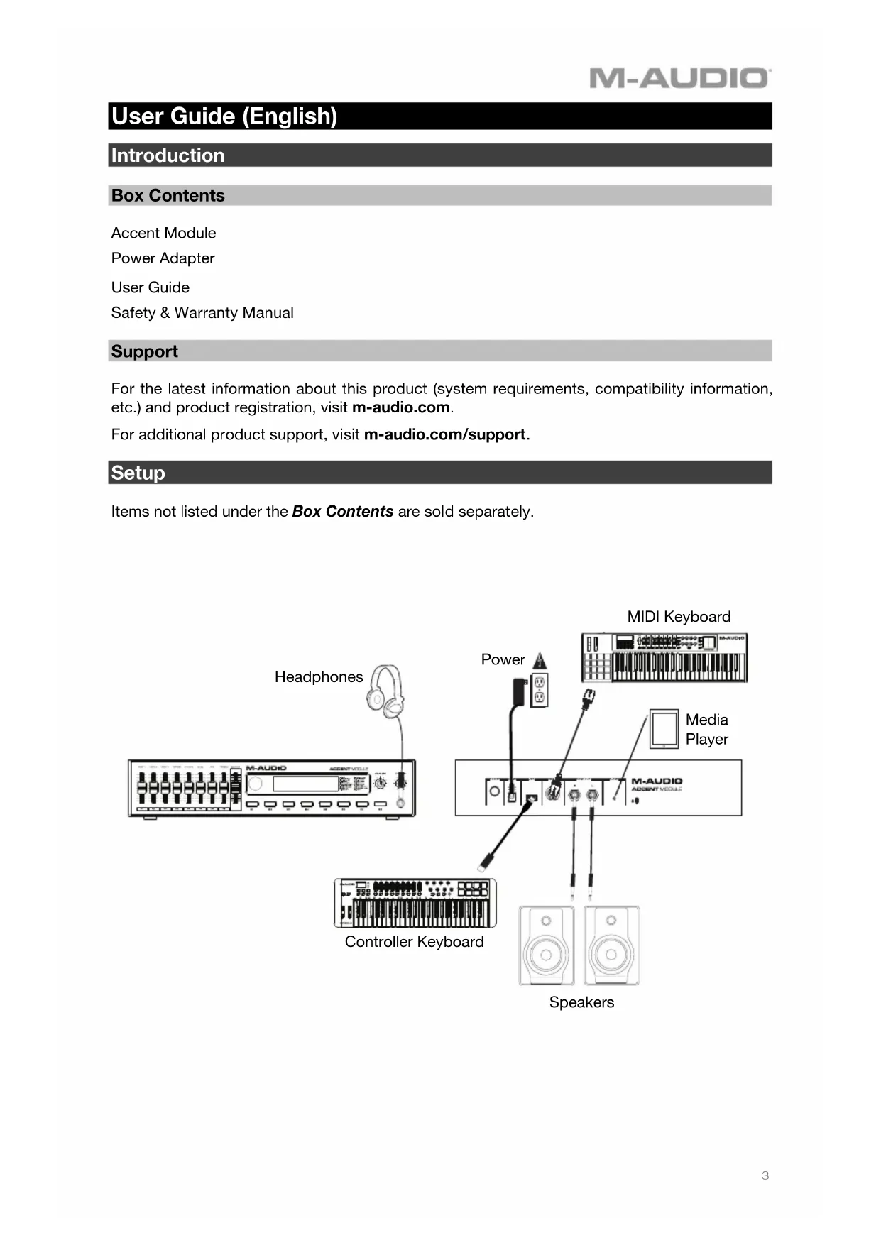 User Guide (English) Introduction Box Contents Accent Module Power Adapter User Guide Safety & Warranty Manual Support For the latest information about this product (system requirements, compatibility information, etc.) and product registration, visit m-audio.com. For additional product support, visit m-audio.com/support. Setup Items not listed under the Box Contents are sold separately.