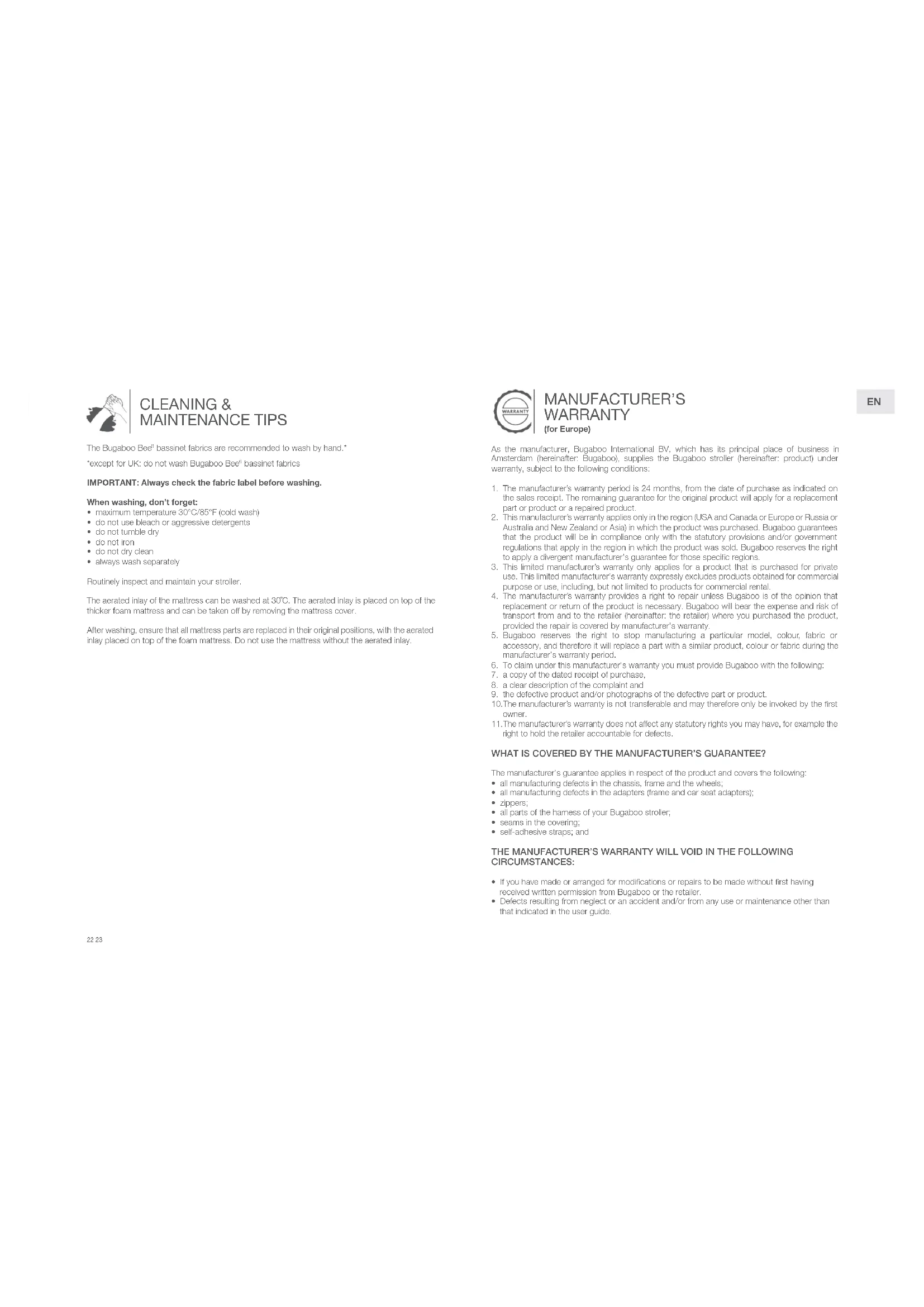 replacement or return of the product is necessary. Bugaboo will bear the expense and risk of transport from and to the retailer (hereinafter: the retailer) where you purchased the product, provided the repair is covered by manufacturer’s warranty.