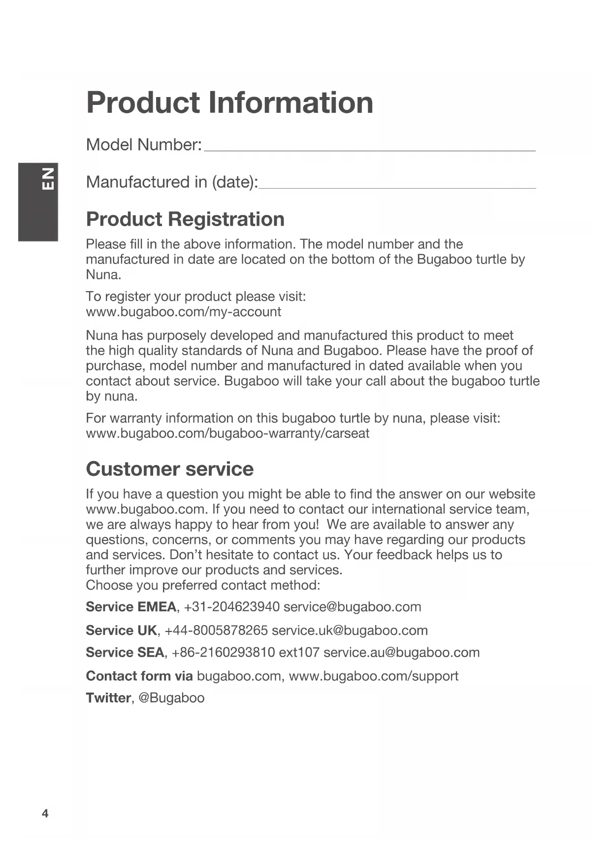 ENProduct Information Model Number: __________________________________________________________________________________________________ Manufactured in (date):__________________________________________________________________________________ Product Registration Please ll in the above information. The model number and the manufactured in date are located on the bottom of the Bugaboo turtle by Nuna. To register your product please visit: www.bugaboo.com/my-account Nuna has purposely developed and manufactured this product to meet the high quality standards of Nuna and Bugaboo. Please have the proof of purchase, model number and manufactured in dated available when you contact about service. Bugaboo will take your call about the bugaboo turtle by nuna. For warranty information on this bugaboo turtle by nuna, please visit: www.bugaboo.com/bugaboo-warranty/carseat Customer service If you have a question you might be able to nd the answer on our website www.bugaboo.com. If you need to contact our international service team, we are always happy to hear from you! We are available to answer any questions, concerns, or comments you may have regarding our products and services. Don’t hesitate to contact us. Your feedback helps us to further improve our products and services. Choose you preferred contact method: Service EMEA, +31-204623940 service@bugaboo.com Service UK, +44-8005878265 service.uk@bugaboo.com Service SEA, +86-2160293810 ext107 service.au@bugaboo.com Contact form via bugaboo.com, www.bugaboo.com/support Twitter, @Bugaboo