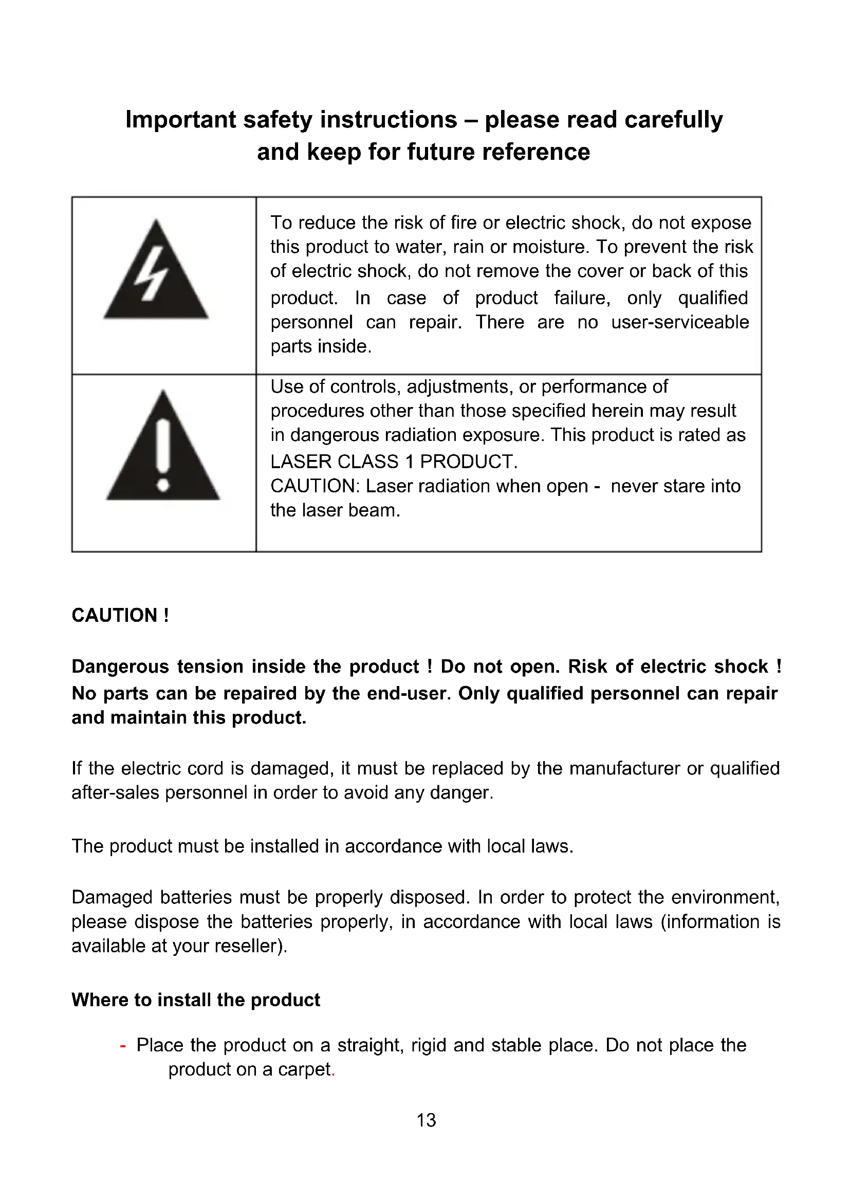 CAUTION ! Dangerous tension inside the product ! Do not open. Risk of electric shock ! No parts can be repaired by the end-user. Only qualified personnel can repair and maintain this product. If the electric cord is damaged, it must be replaced by the manufacturer or qualified after-sales personnel in order to avoid any danger. The product must be installed in accordance with local laws. Damaged batteries must be properly disposed. In order to protect the environment, please dispose the batteries properly, in accordance with local laws (information is available at your reseller). Where to install the product - Place the product on a straight, rigid and stable place. Do not place the product on a carpet.