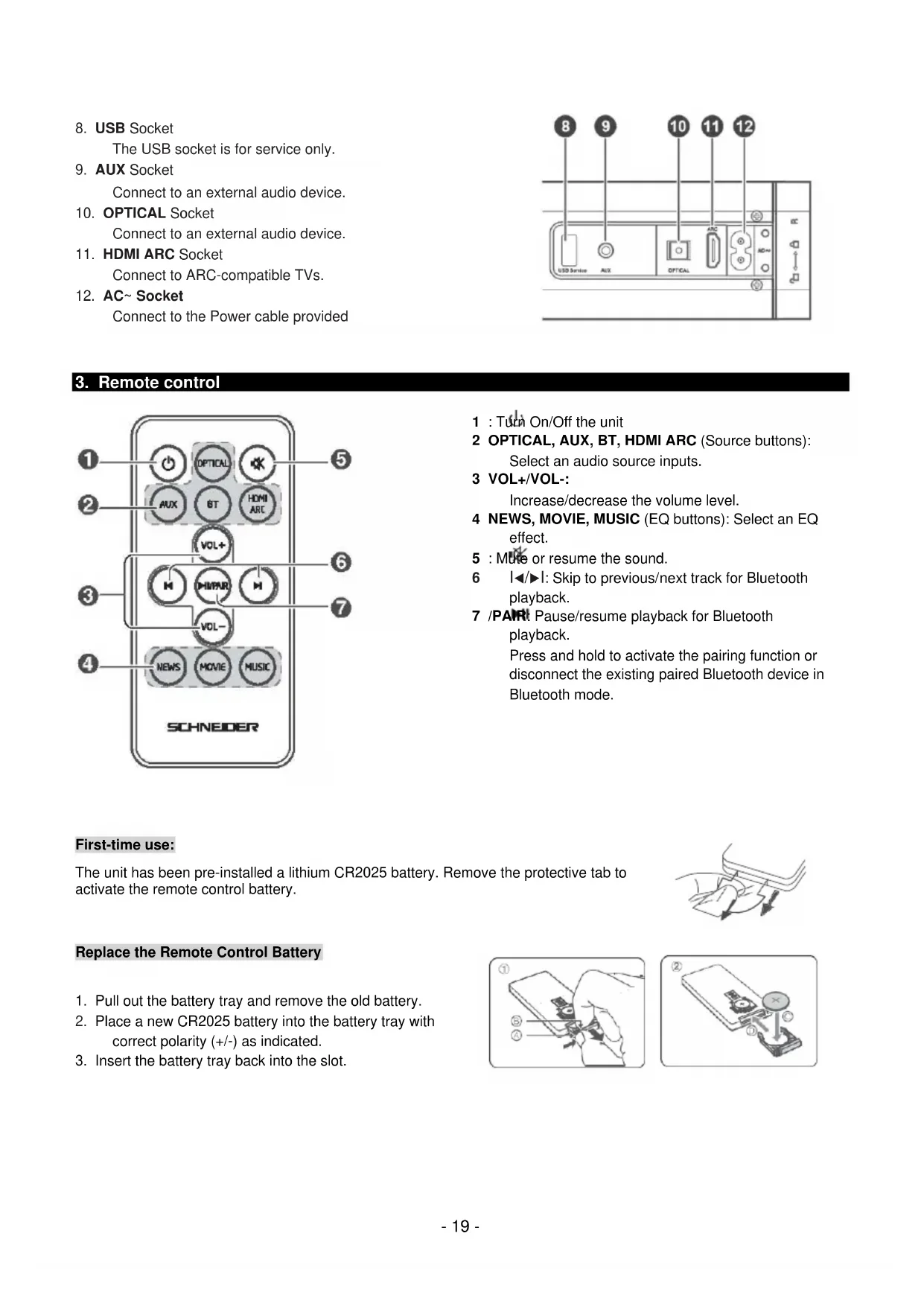 CAUTION ! Dangerous tension inside the product ! Do not open. Risk of electric shock ! No parts can be repaired by the end-user. Only qualified personnel can repair and maintain this product. If the electric cord is damaged, it must be replaced by the manufacturer or qualified after-sales personnel in order to avoid any danger. The product must be installed in accordance with local laws. Damaged batteries must be properly disposed. In order to protect the environment, please dispose the batteries properly, in accordance with local laws (information is available at your reseller). Remote control battery (included) shall not be exposed to excessive heat (e.g. from sun or fire). Note: Device operates in frequency range 2454-2483.5MHz is restricted to indoor use in France Where to install the product - Place the product on a straight, rigid and stable place. Do not place the product on a carpet. - Do not place the product on top of another that may cause overheating (for example, a receiver or amplifier). - Do not place anything underneath the product (for example, CDs or magazines). Proper ventilation - Place the product in a sufficiently–aerated place to avoid overheating. Allow at least 10cm spacing at the back and top of the product, and 5cm spacing on both sides to prevent overheating. - Do not place items such as newspapers, tablecloth, curtains, in front of the ventilating openings. Do not expose the product to high temperatures, moisture, water and dust. - The apparatus shall not be exposed to dripping or splashing. No object filled with liquids, such as vases, shall be placed on the apparatus. - Do not place other items close to this product that may damage it (for example, objects containing water or lightened candles). - No naked flame sources, such as lighted candles, should be placed on the apparatus. Electric supply - Please unplug the product in case of prolonged non-use. - If the supply cable is damaged, it must be replaced by the manufacturer or qualified after-sales personnel to avoid any danger. - This product must be connected to an electrical supply 230V ~ 50Hz. - The mains plug is used as the disconnect device, so the disconnect device shall remain readily operable - Only use this product with the AC adaptor provided. WARNING - Do not ingest the battery, Chemical Burn Hazard (The remote control supplied with) this product contains a coin/button cell battery. If the coin/button cell battery is swallowed, it can cause severe internal burns in just 2 hours and can lead to death. - Keep new and used batteries away from children. - If the battery compartment does not close securely, stop using the product and keep it away from children. - If you think batteries might have been swallowed or placed inside any part of the body, seek immediate medical attention.- 17 - EU declaration of conformity Hereby, Admea declares that this Bluetooth sound bar is in compliance with the essential requirements and other provisions of the Radio Equipment Directive (RED) 2014/53/EU. The full text of the EU declaration of conformity is available at the following internet address: http://www.schneiderconsumer.com