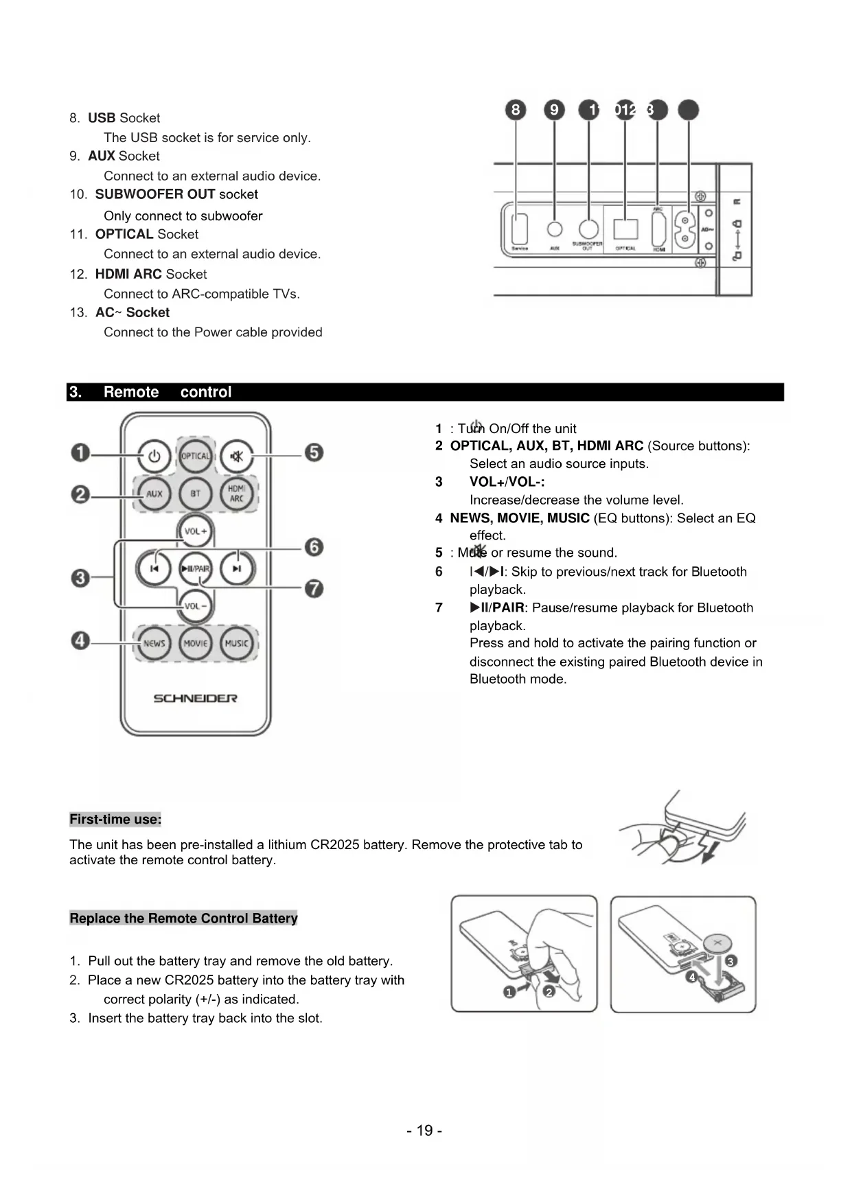 To reduce the risk of fire or electric shock, do not expose this product to water, rain or moisture. To prevent the risk of electric shock, do not remove the cover or back of this product. In case of product failure, only qualified personnel can repair. There are no user- serviceable parts inside. CAUTION ! Dangerous tension inside the product ! Do not open. Risk of electric shock ! No parts can be repaired by the end-user. Only qualified personnel can repair and maintain this product. If the electric cord is damaged, it must be replaced by the manufacturer or qualified after-sales personnel in order to avoid any danger. The product must be installed in accordance with local laws. Damaged batteries must be properly disposed. In order to protect the environment, please dispose the batteries properly, in accordance with local laws (information is available at your reseller). Remote control battery (included) shall not be exposed to excessive heat (e.g. from sun or fire). Note: Device operates in frequency range 2454-2483.5MHz is restricted to indoor use in France Where to install the product - Place the product on a straight, rigid and stable place. Do not place the product on a carpet. - Do not place the product on top of another that may cause overheating (for example, a receiver or amplifier). - Do not place anything underneath the product (for example, CDs or magazines). Proper ventilation - Place the product in a sufficiently–aerated place to avoid overheating. Allow at least 10cm spacing at the back and top of the product, and 5cm spacing on both sides to prevent overheating. - Do not place items such as newspapers, tablecloth, curtains, in front of the ventilating openings. Do not expose the product to high temperatures, moisture, water and dust. - The apparatus shall not be exposed to dripping or splashing. No object filled with liquids, such as vases, shall be placed on the apparatus. - Do not place other items close to this product that may damage it (for example, objects containing water or lightened candles). - No naked flame sources, such as lighted candles, should be placed on the apparatus. Electric supply - Please unplug the product in case of prolonged non-use. - If the supply cable is damaged, it must be replaced by the manufacturer or qualified after-sales personnel to avoid any danger. - This product must be connected to an electrical supply 230V ~ 50Hz. - The mains plug is used as the disconnect device, so the disconnect device shall remain readily operable - Only use this product with the AC adaptor provided. WARNING - Do not ingest the battery, Chemical Burn Hazard (The remote control supplied with) this product contains a coin/button cell battery. If the coin/button cell battery is swallowed, it can cause severe internal burns in just 2 hours and can lead to death. - Keep new and used batteries away from children. - If the battery compartment does not close securely, stop using the product and keep it away from children. - If you think batteries might have been swallowed or placed inside any part of the body, seek immediate medical attention.- 17 - EU declaration of conformity Hereby, Admea declares that this Bluetooth sound bar is in compliance with the essential requirements and other provisions of the Radio Equipment Directive (RED) 2014/53/EU. The full text of the EU declaration of conformity is available at the following internet address: http://www.schneiderconsumer.com