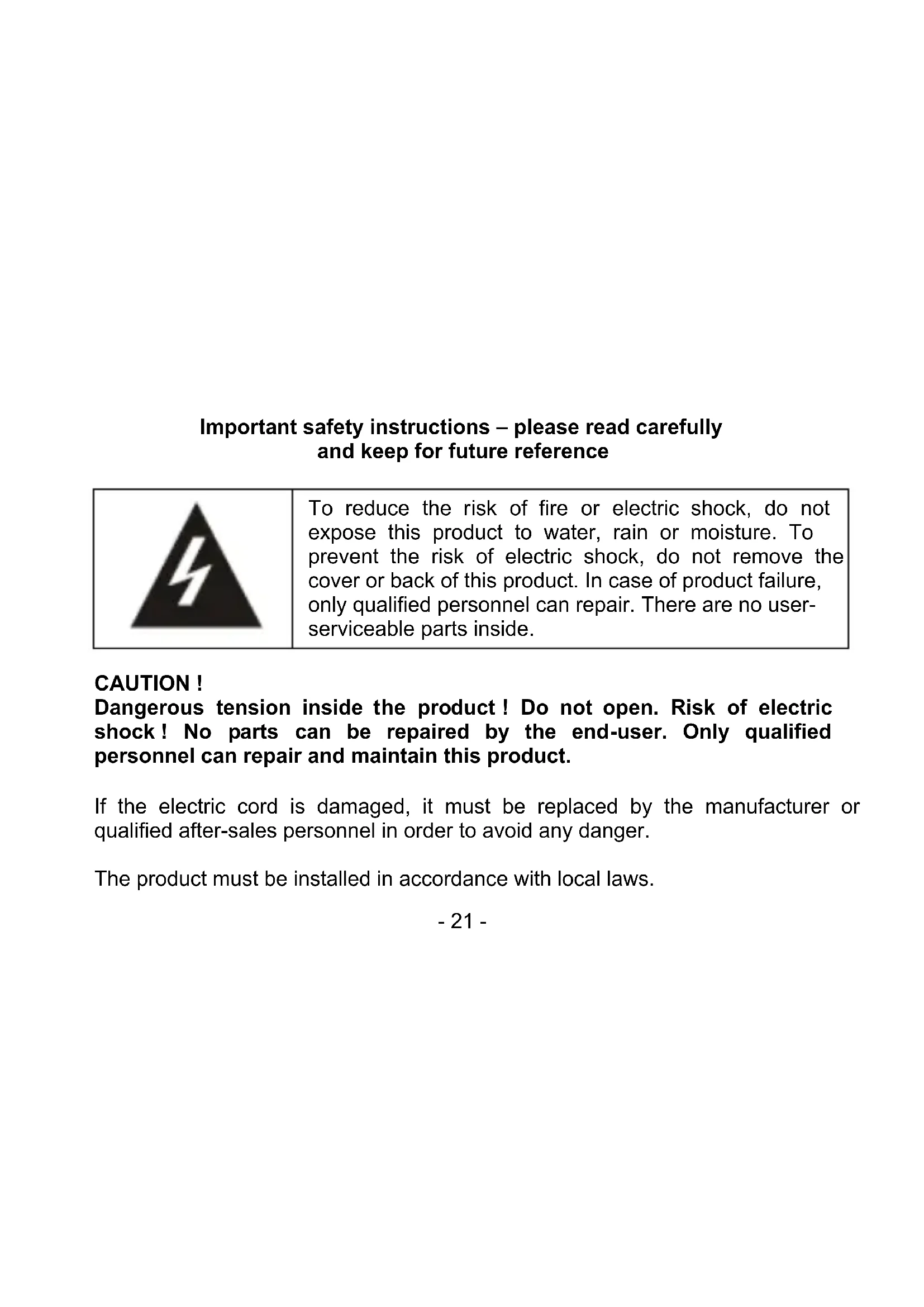 CAUTION ! Dangerous tension inside the product ! Do not open. Risk of electric shock ! No parts can be repaired by the end-user. Only qualified personnel can repair and maintain this product. If the electric cord is damaged, it must be replaced by the manufacturer or qualified after-sales personnel in order to avoid any danger. The product must be installed in accordance with local laws.- 22 - Damaged batteries must be properly disposed. In order to protect the environment, please dispose the batteries properly, in accordance with local laws (information is available at your reseller). Where to install the product - Place the product on a straight, rigid and stable place. Do not place the product on a carpet. - Do not place the product on top of another that may cause overheating (for example, a receiver or amplifier). - Do not place anything underneath the product (for example, CDs or magazines). Proper ventilation - Place the product in a sufficiently–aerated place to avoid overheating. Allow at least 10cm spacing at the back and top of the product, and 5cm spacing on both sides to prevent overheating. - Do not place items such as newspapers, tablecloth, curtains, in front of the ventilating openings.- 23 - Do not expose the product to high temperatures, moisture, water and dust. - The apparatus shall not be exposed to dripping or splashing. No object filled with liquids, such as vases, shall be placed on the apparatus. - Do not place other items close to this product that may damage it (for example, objects containing water or lightened candles). - No naked flame sources, such as lighted candles, should be placed on the apparatus. Electric supply - Please unplug the product in case of prolonged non-use. - If the supply cable is damaged, it must be replaced by the manufacturer or qualified after-sales personnel to avoid any danger. - This product must be connected to an electrical supply 230V ~ 50Hz. - The mains plug is used as the disconnect device, so the disconnect device shall remain readily operable. - Do not use the product with a battery different from the one provided. - CAUTION: Explosion risk if the battery is not replaced correctly. Do not attempt to replace the battery with a different battery version.- 24 - - Batteries (battery pack or batteries installed) shall not be exposed to excessive heat such as sunshine or fire or any other heat sources.