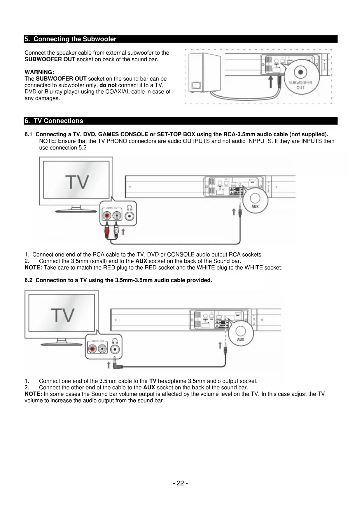The SUBWOOFER OUT socket on the sound bar can be connected to subwoofer only, do not connect it to a TV, DVD or Blu-ray player using the COAXIAL cable in case of any damages.