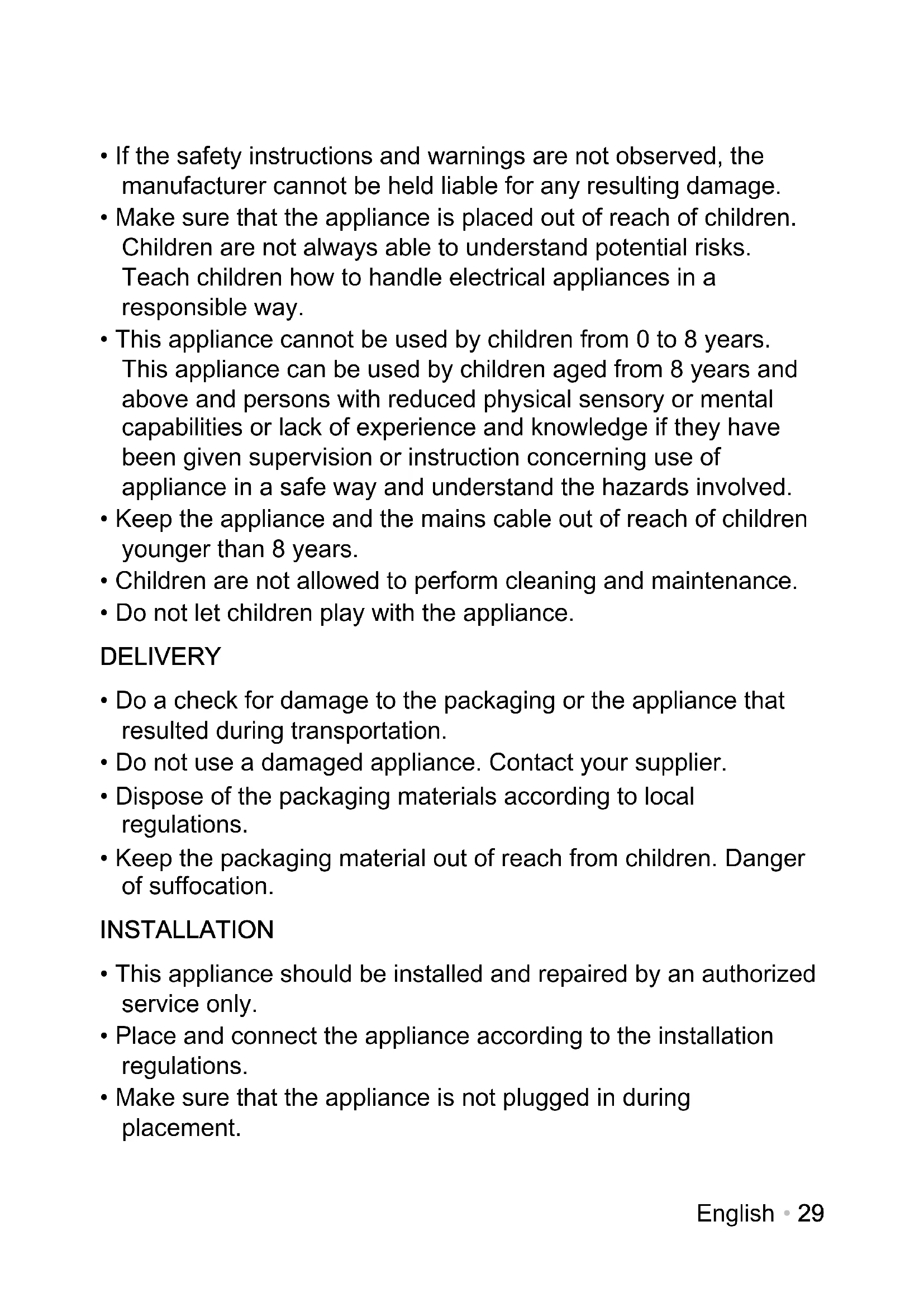 - Do not let children play with the appliance. DELIVERY