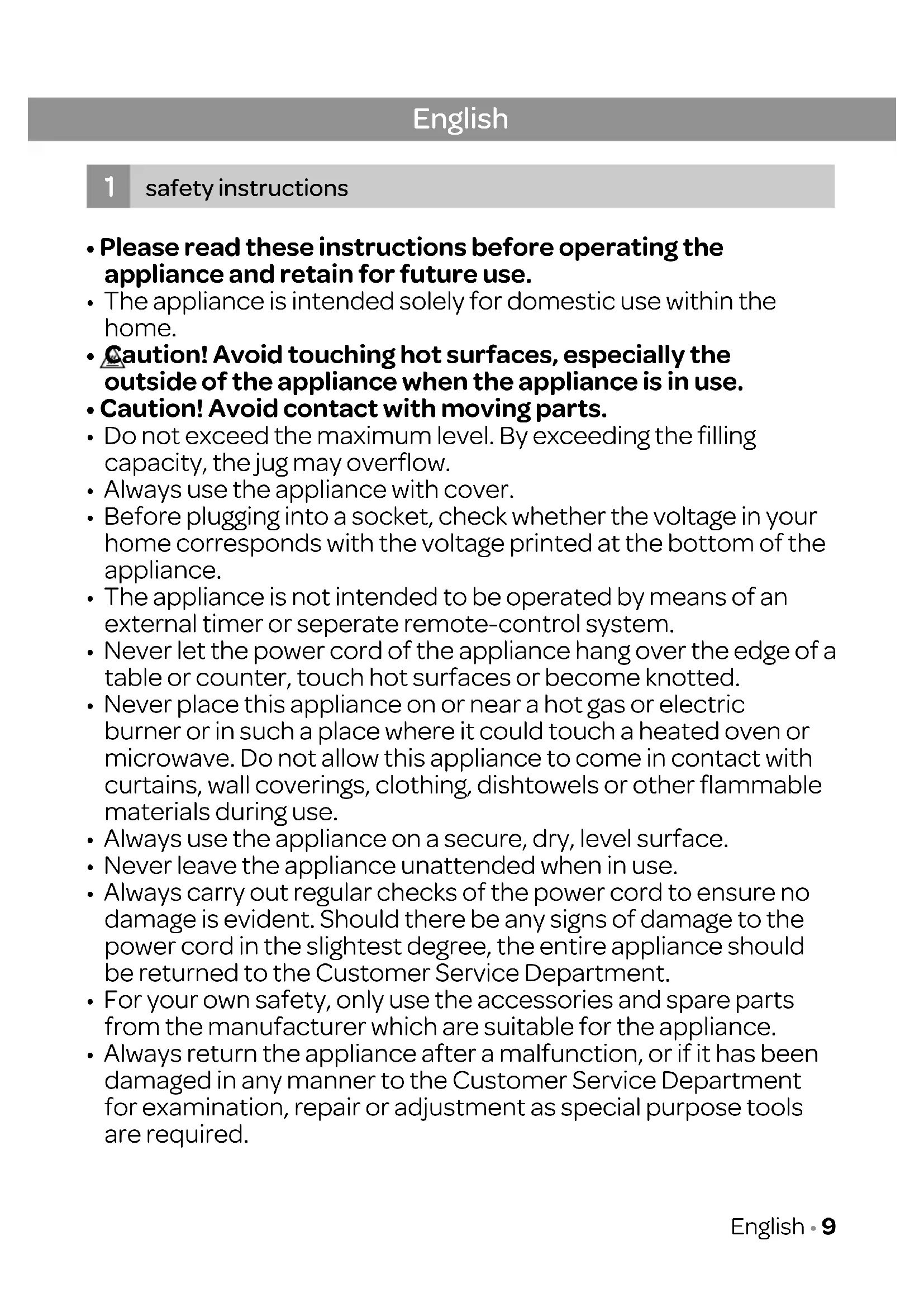 - Always return the appliance after a malfunction, or if it has been damaged in any manner to the Customer Service Department for examination, repair or adjustment as special purpose tools are required. English safety instructions