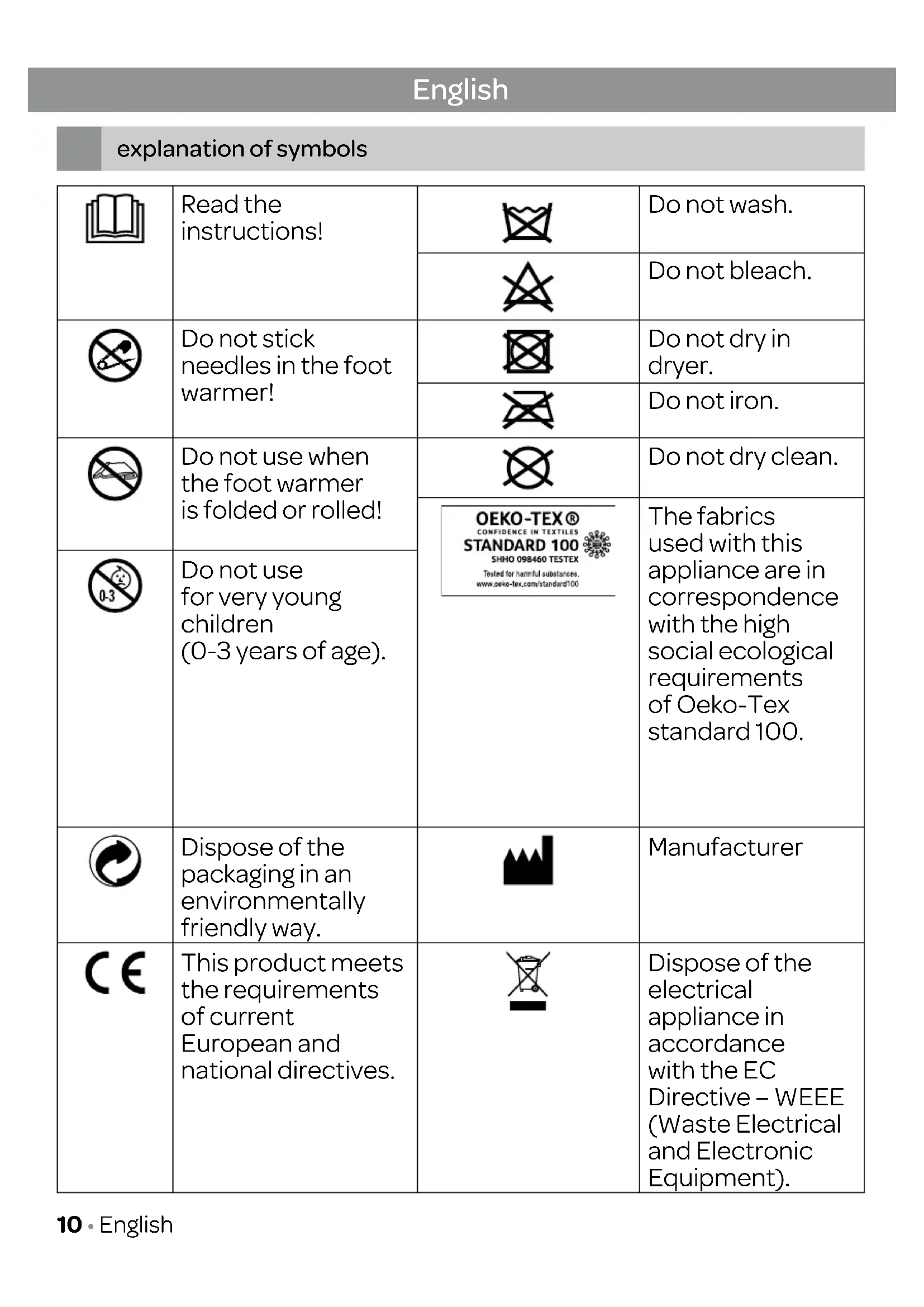 Klein huishoudelijke apparaten horen niet in de vuilnisbak. Breng ze naar de betreffende afvalverwerkingsafdeling van uw gemeente. Nederlands • 9Read the instructions! Do not wash. Do not bleach. Do not stick needles in the foot warmer! Do not dry in dryer. Do not iron. Do not use when the foot warmer is folded or rolled! Do not dry clean. The fabrics used with this appliance are in correspondence with the high social ecological requirements of Oeko-Tex standard 100. Do not use for very young children (0-3 years of age). Dispose of the packaging in an environmentally friendly way. Manufacturer This product meets the requirements of current European and national directives. Dispose of the electrical appliance in accordance with the EC Directive – WEEE (Waste Electrical and Electronic Equipment). English explanation of symbols 10 • EnglishThe appliance is doubly insulated and corresponds with protection class 2. WARNING; Warning for risk of injury or hazard to your health. CAUTION; Safety warning for possible damage to the appliance or its accessories. ATTENTION; Point of attention for important information. English • 11• Non-observance of the following notes may result in personal injury or material damage (electric shock, skin burns, fire). The following safety and hazard information is not only intended to protect your health and the health of others, it should also protect the product. For this reason, pay attention to these safety notes and include these instructions when handing over the product to others.