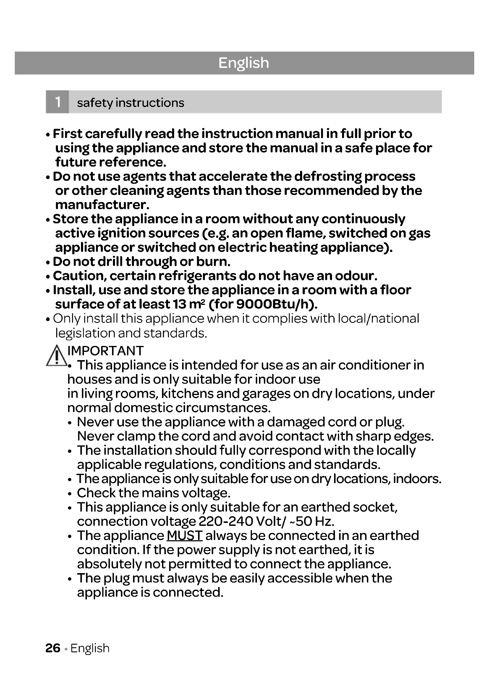 - This appliance is intended for use as an air conditioner in houses and is only suitable for indoor use in living rooms, kitchens and garages on dry locations, under normal domestic circumstances.