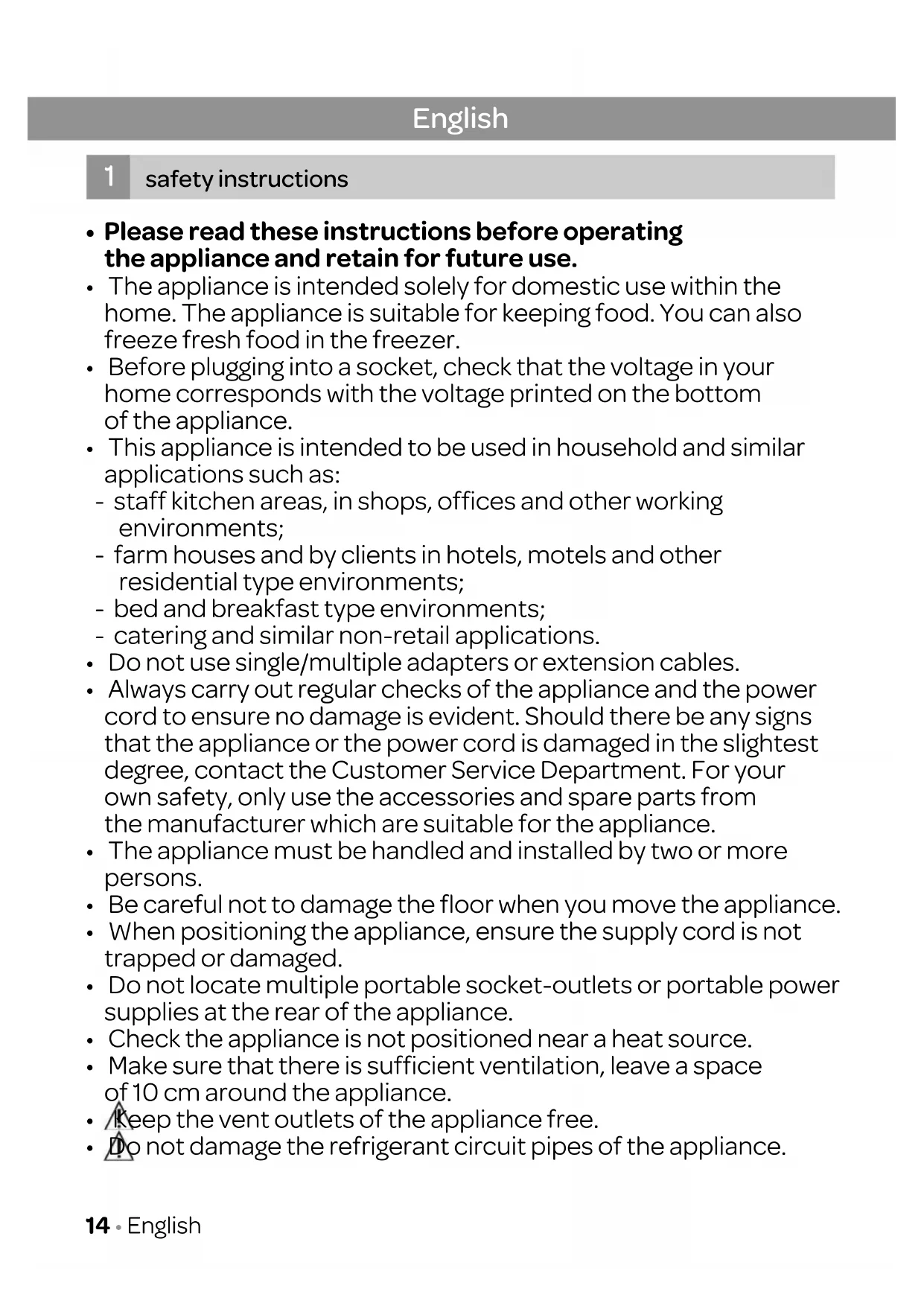 - Do not damage the refrigerant circuit pipes of the appliance. English safety instructions