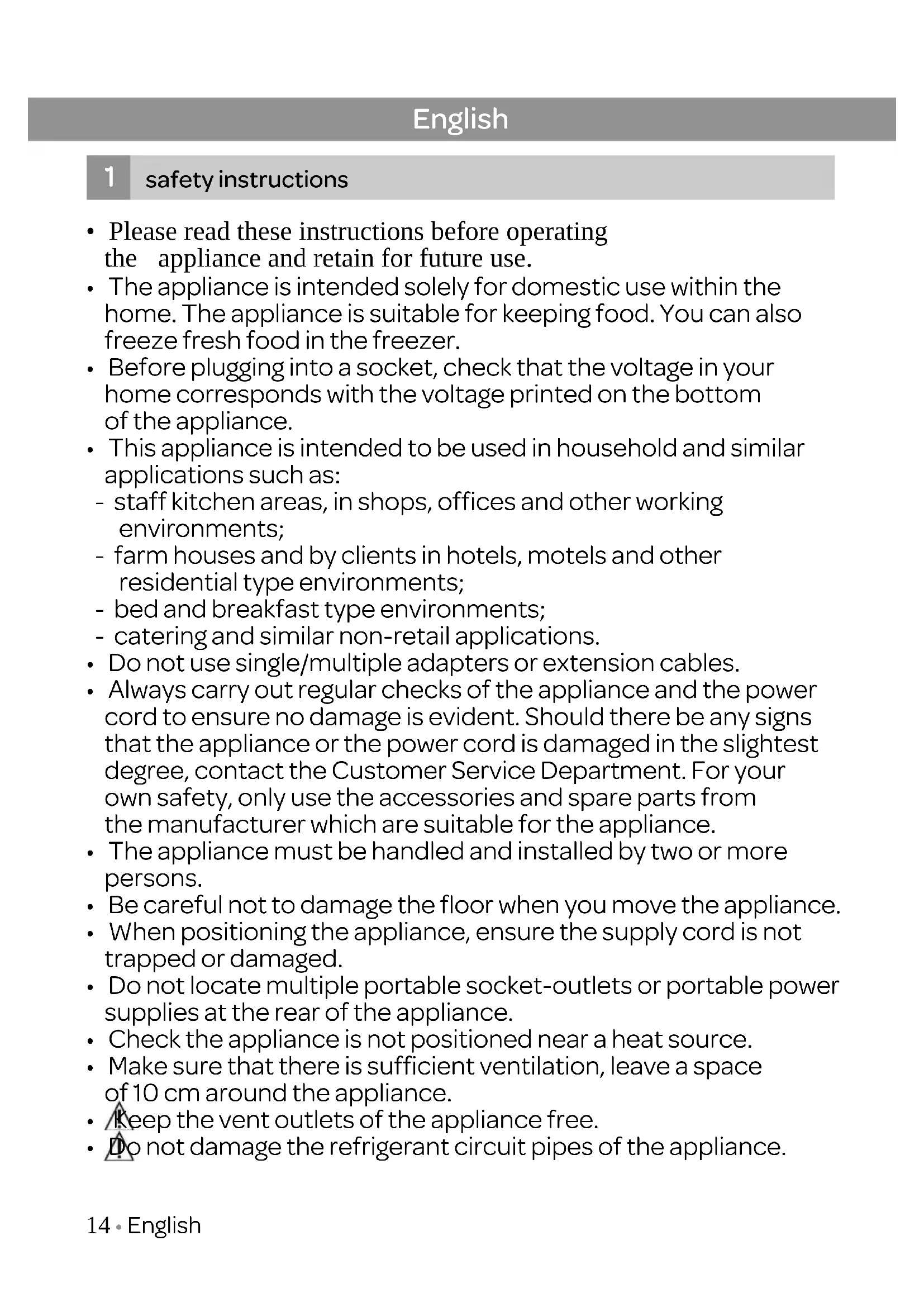 - Do not damage the refrigerant circuit pipes of the appliance. English safety instructions