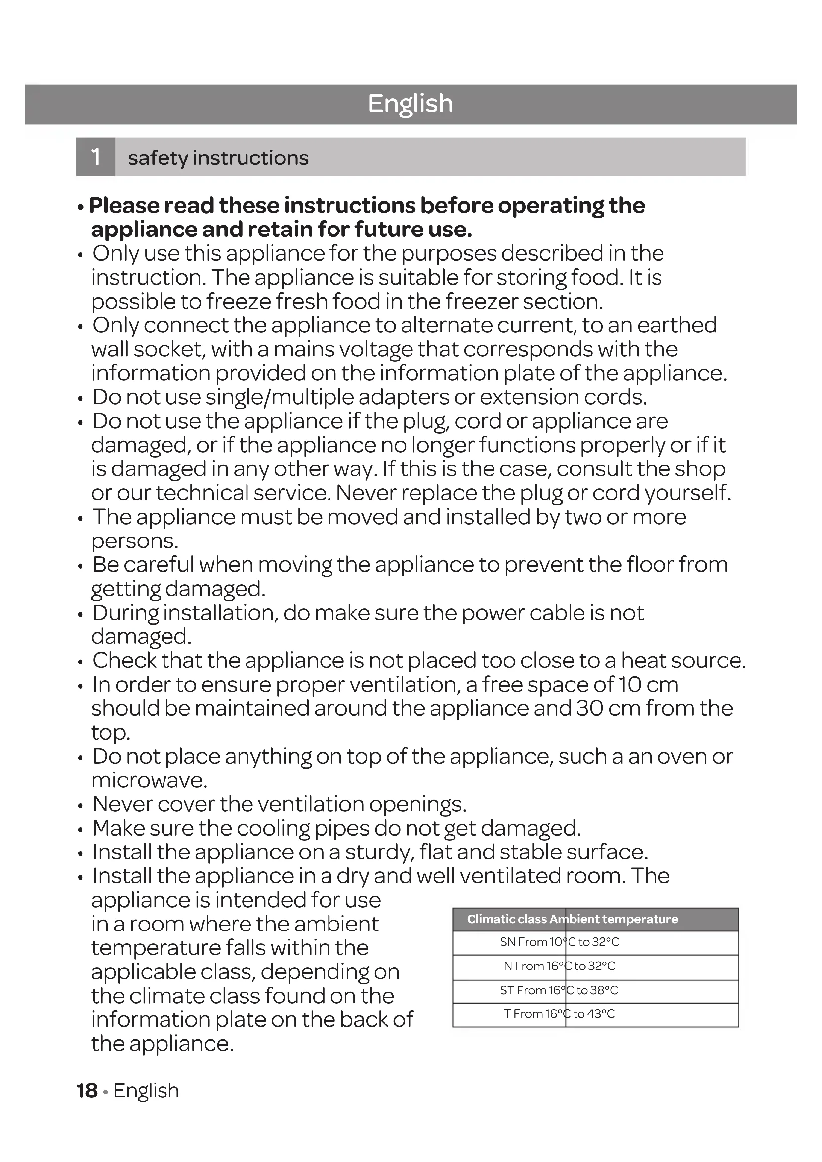 - Install the appliance in a dry and well ventilated room. The appliance is intended for use in a room where the ambient temperature falls within the applicable class, depending on the climate class found on the information plate on the back of the appliance. English safety instructions