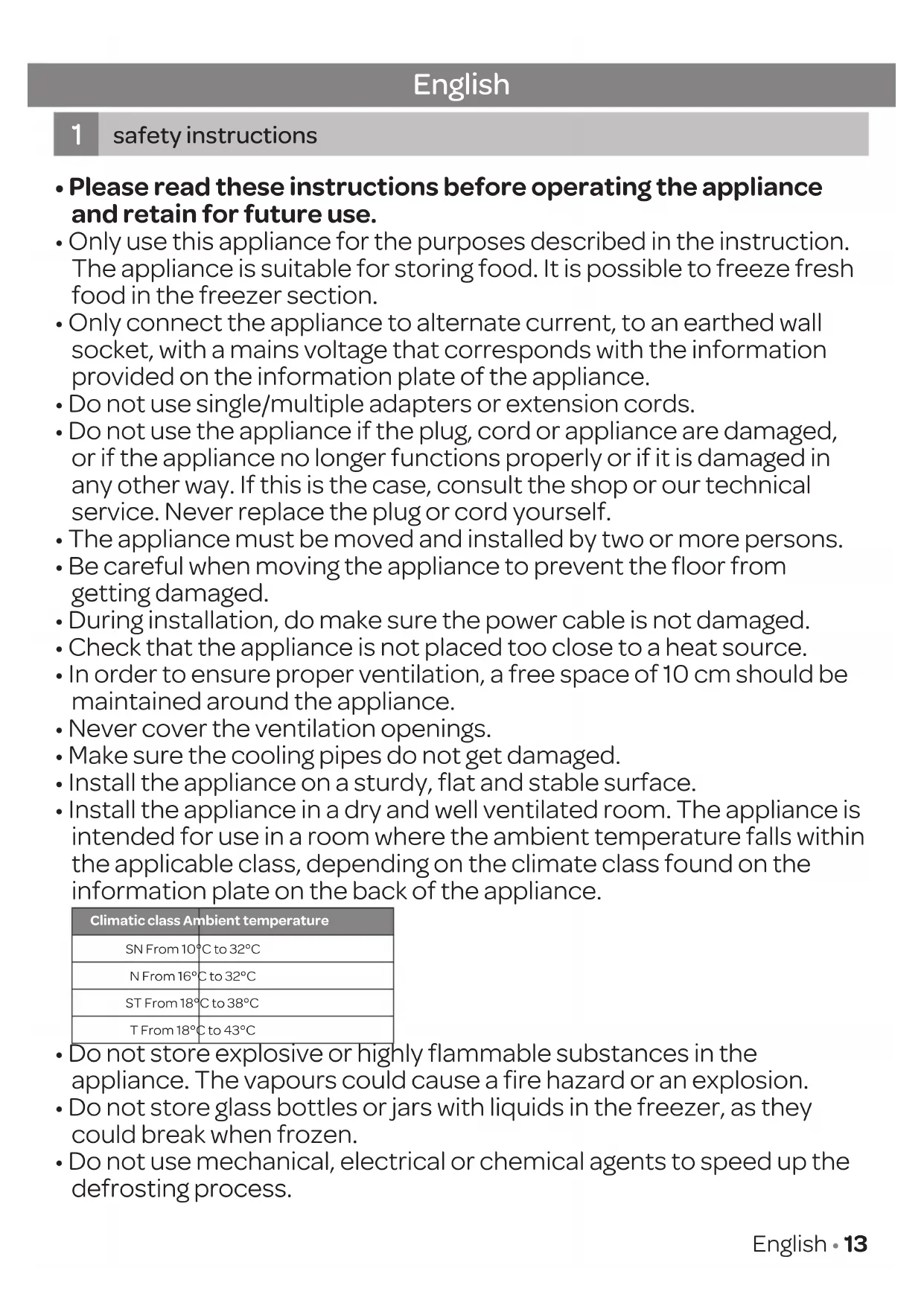 - Install the appliance in a dry and well ventilated room. The appliance is intended for use in a room where the ambient temperature falls within the applicable class, depending on the climate class found on the information plate on the back of the appliance. Climatic class Ambient temperature SN From 10°C to 32°C N From 16°C to 32°C ST From 18°C to 38°C T From 18°C to 43°C