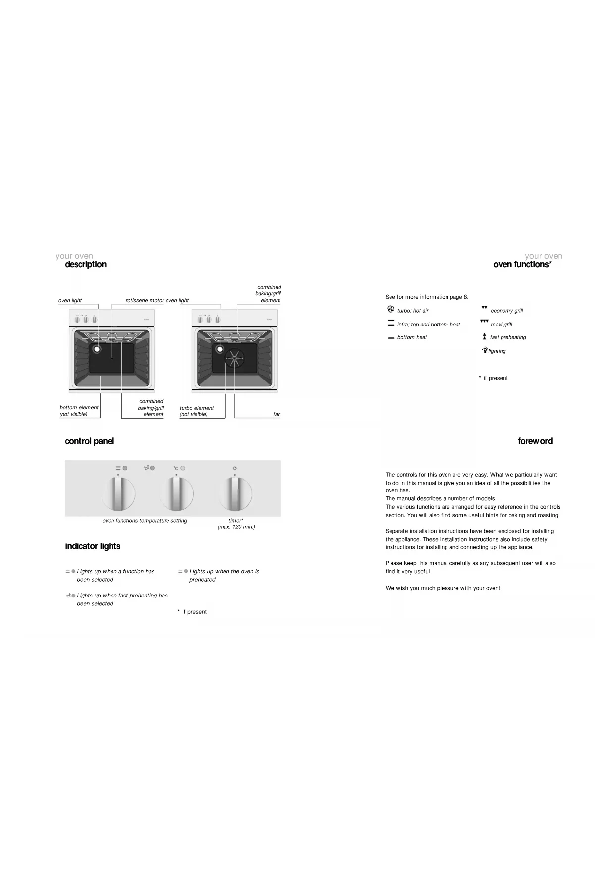 - FKW-freies Postyrol (PS-Hartschaum). Diese Materialien sind umweltgerecht und nach den geltenden behördlichen Vorschriften zu entsorgen. Die Behörden können Ihnen auch Informationen über die umweltgerechte Entsorgung Ihrer ausgedienten Hausgeräte erteilen.The controls for this oven are very easy. What we particularly want to do in this manual is give you an idea of all the possibilities the oven has. The manual describes a number of models. The various functions are arranged for easy reference in the controls section. You will also find some useful hints for baking and roasting. Separate installation instructions have been enclosed for installing the appliance. These installation instructions also include safety instructions for installing and connecting up the appliance. Please keep this manual carefully as any subsequent user will also find it very useful. We wish you much pleasure with your oven! your oven oven functions* your oven description oven light rotisserie motor oven light combined baking/grill element bottom element (not visible) combined baking/grill element fan turbo element (not visible) foreword See for more information page 8. turbo; hot air infra; top and bottom heat bottom heat economy grill maxi grill fast preheating H lighting