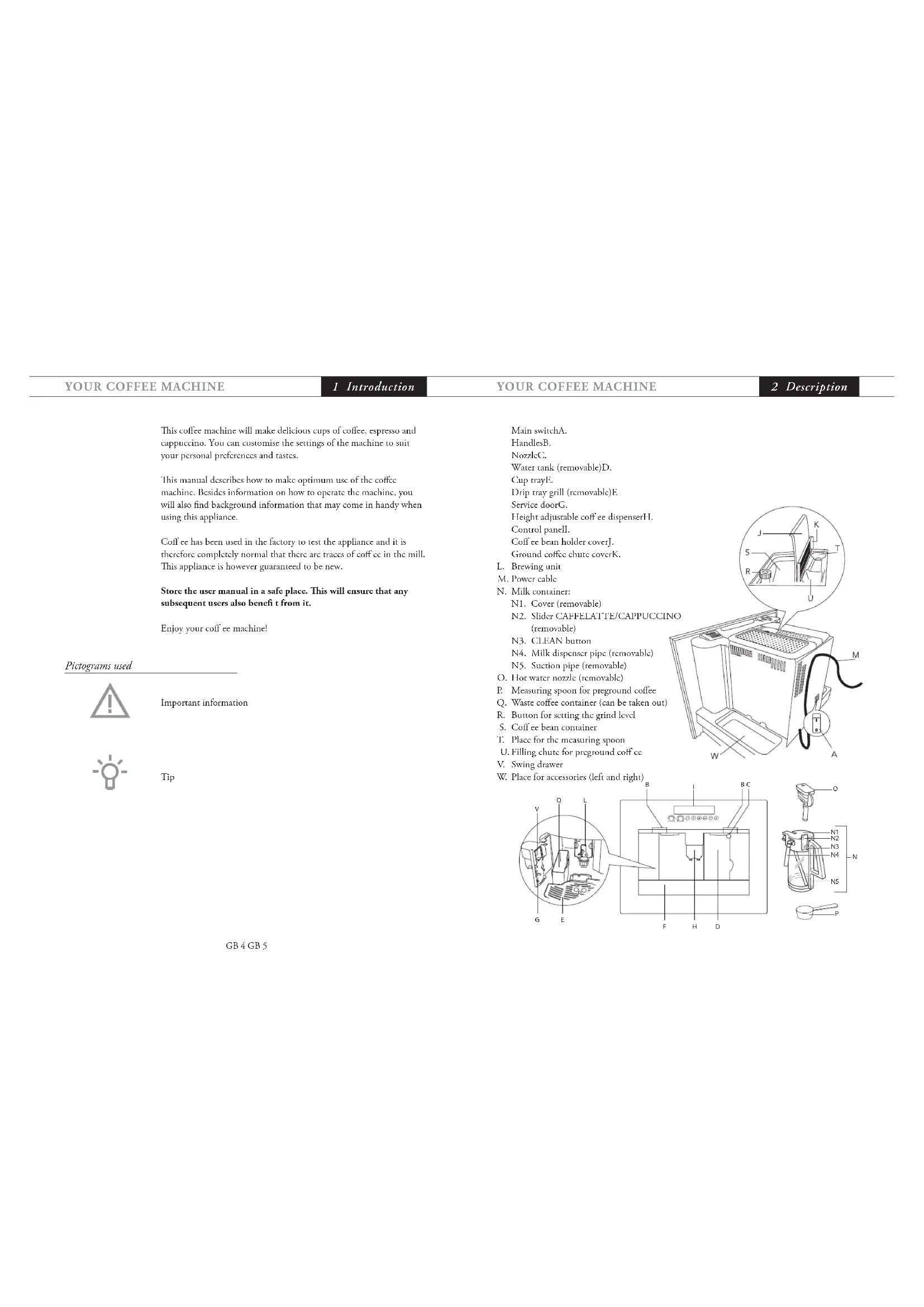 Main switchA. HandlesB. NozzleC. Water tank (removable)D. Cup trayE. Drip tray grill (removable)F. Service doorG. Height adjustable coff ee dispenserH. Control panelI. Coff ee bean holder coverJ. Ground coff ee chute coverK. Brewing unitL. Power cableM. Milk container:N. N1. Cover (removable) N2. Slider CAFFELATTE/CAPPUCCINO (removable) N3. CLEAN button N4. Milk dispenser pipe (removable) N5. Suction pipe (removable) Hot water nozzle (removable)O. Measuring spoon for preground coff eeP. Waste coff ee container (can be taken out)Q. Button for setting the grind levelR. Coff ee bean containerS. Place for the measuring spoonT. Filling chute for preground coff eeU. Swing drawerV. Place for accessories (left and right)W.