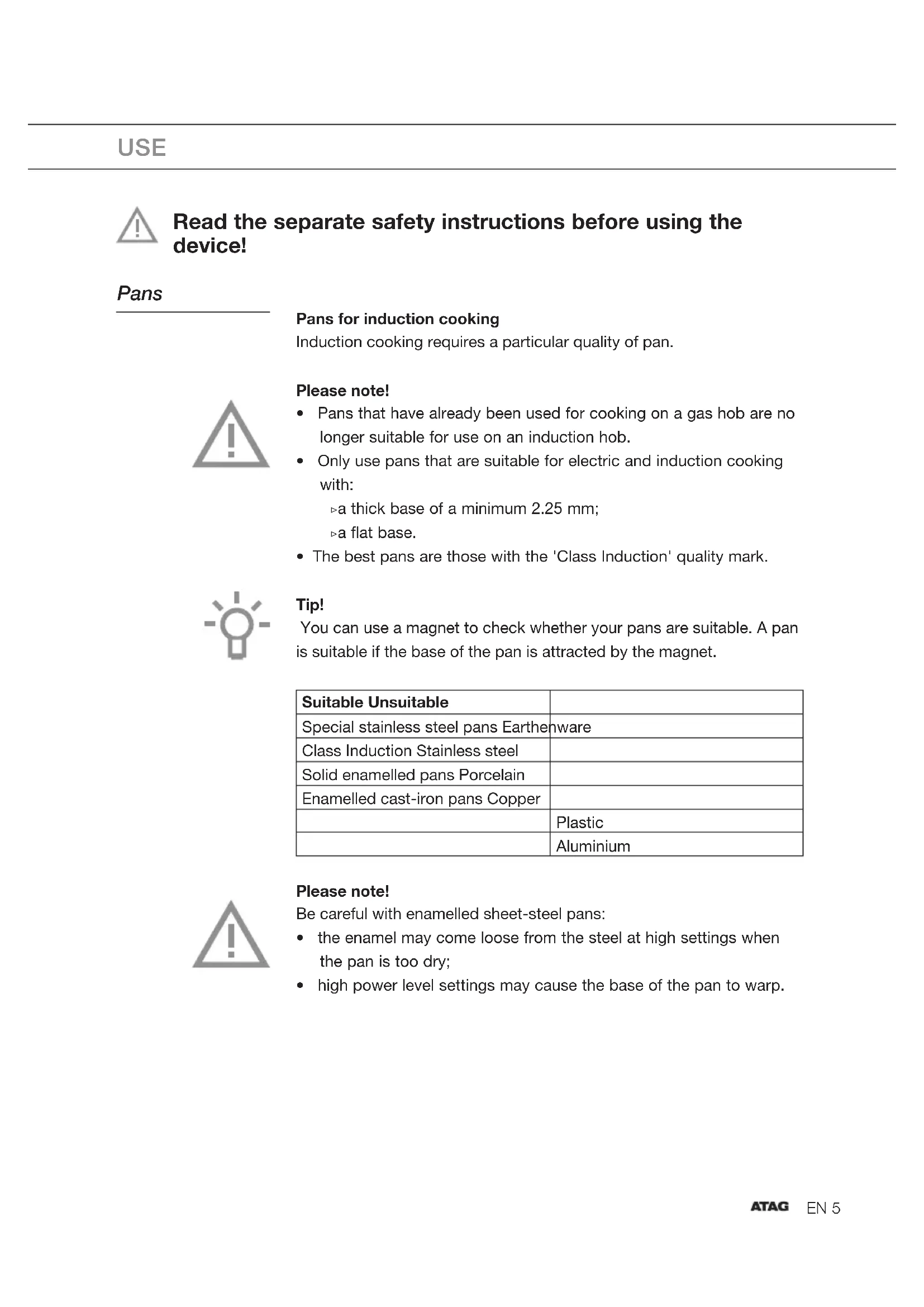 - The best pans are those with the 'Class Induction' quality mark. Tip! You can use a magnet to check whether your pans are suitable. A pan is suitable if the base of the pan is attracted by the magnet. Suitable Unsuitable Special stainless steel pans Earthenware Class Induction Stainless steel Solid enamelled pans Porcelain Enamelled cast-iron pans Copper Plastic Aluminium Please note! Be careful with enamelled sheet-steel pans: