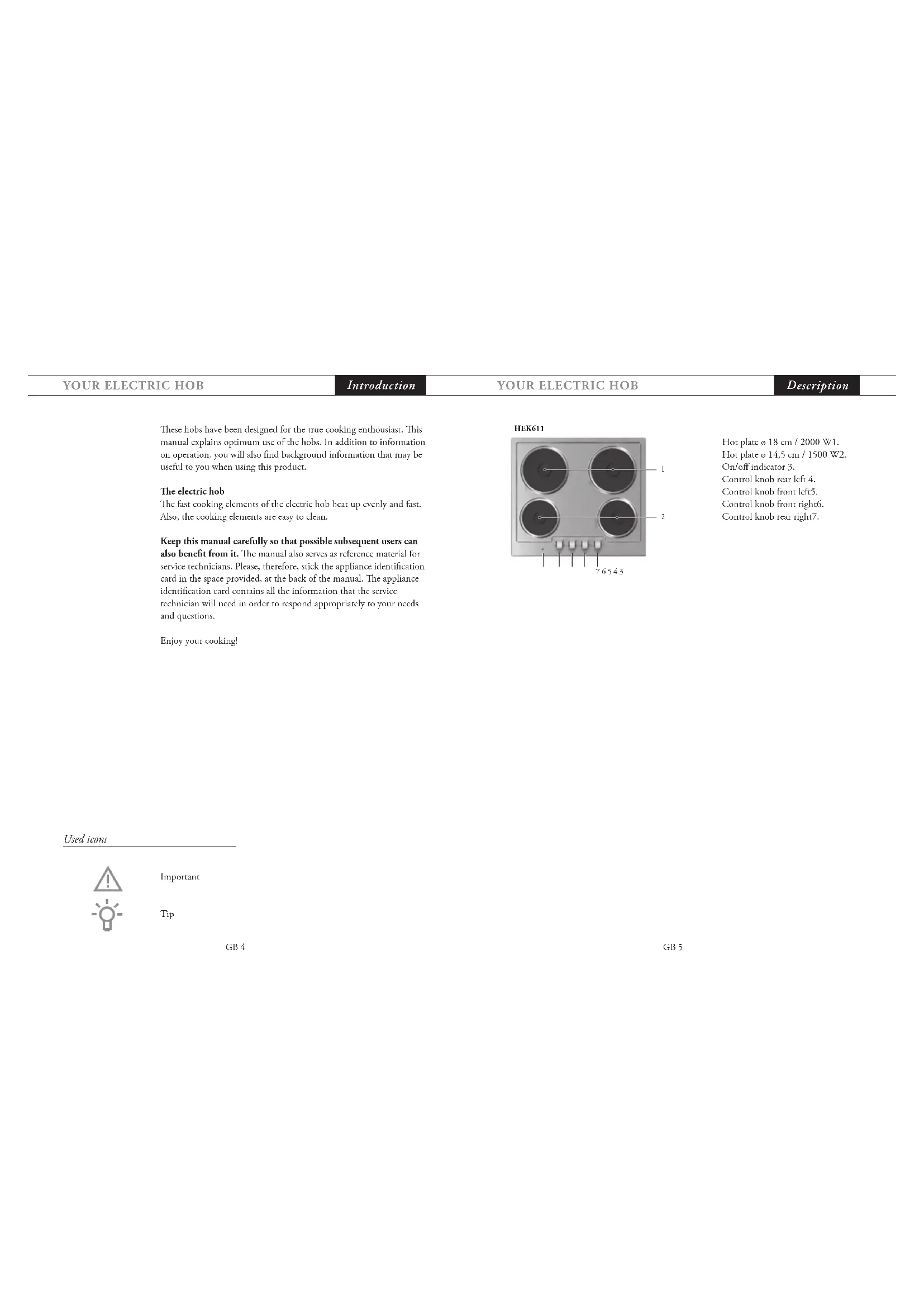 ese hobs have been designed for the true cooking enthousiast. is manual explains optimum use of the hobs. In addition to information on operation, you will also find background information that may be useful to you when using this product. e electric hob e fast cooking elements of the electric hob heat up evenly and fast. Also, the cooking elements are easy to clean. Keep this manual carefully so that possible subsequent users can also benefit from it. e manual also serves as reference material for service technicians. Please, therefore, stick the appliance identification card in the space provided, at the back of the manual. e appliance identification card contains all the information that the service technician will need in order to respond appropriately to your needs and questions. Enjoy your cooking! Used icons Important Tip HEK611