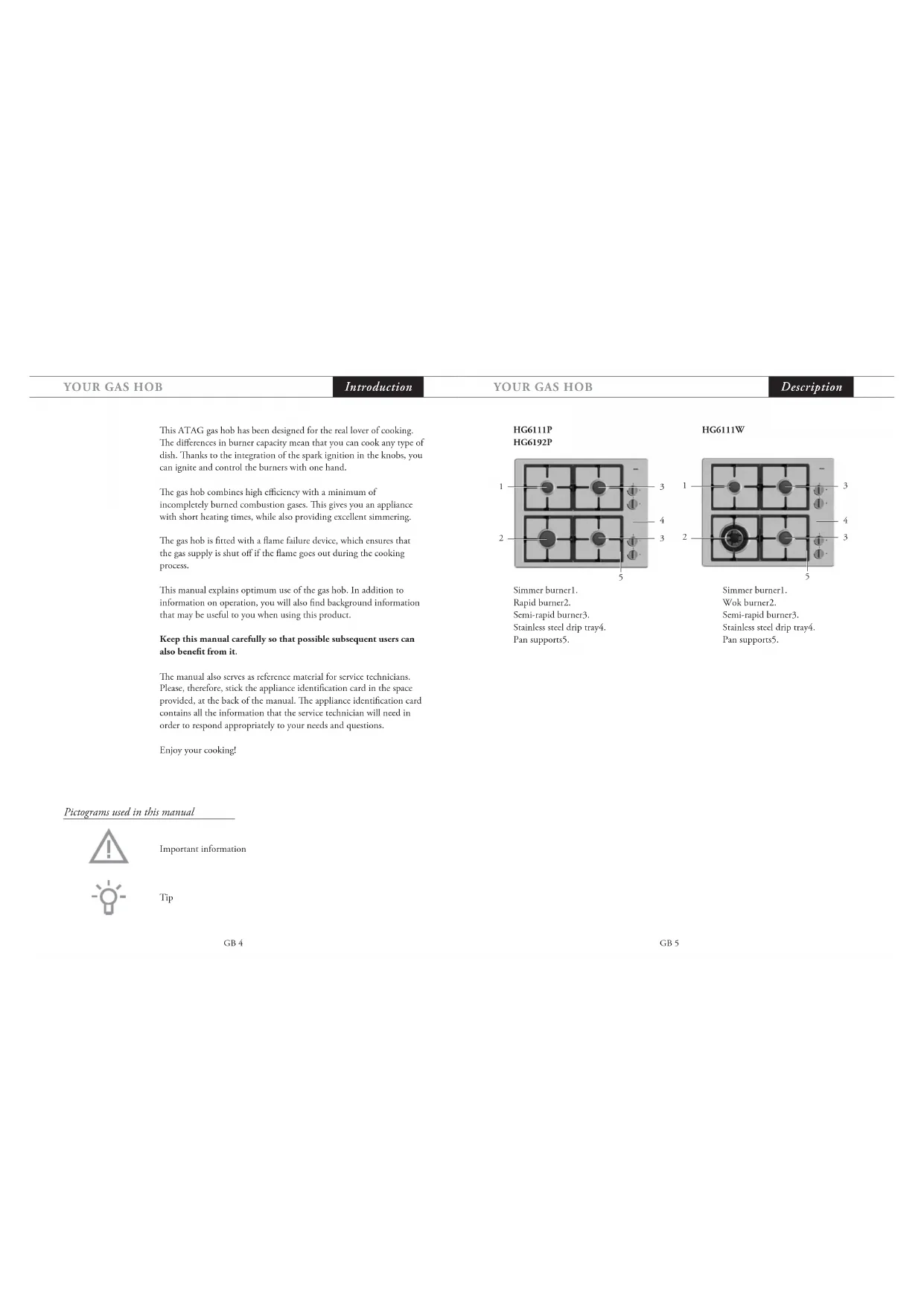 is ATAG gas hob has been designed for the real lover of cooking. e differences in burner capacity mean that you can cook any type of dish. anks to the integration of the spark ignition in the knobs, you can ignite and control the burners with one hand. e gas hob combines high efficiency with a minimum of incompletely burned combustion gases. is gives you an appliance with short heating times, while also providing excellent simmering. e gas hob is fitted with a flame failure device, which ensures that the gas supply is shut off if the flame goes out during the cooking process. is manual explains optimum use of the gas hob. In addition to information on operation, you will also find background information that may be useful to you when using this product. Keep this manual carefully so that possible subsequent users can also benefit from it. e manual also serves as reference material for service technicians. Please, therefore, stick the appliance identification card in the space provided, at the back of the manual. e appliance identification card contains all the information that the service technician will need in order to respond appropriately to your needs and questions. Enjoy your cooking! Pictograms used in this manual Important information Tip