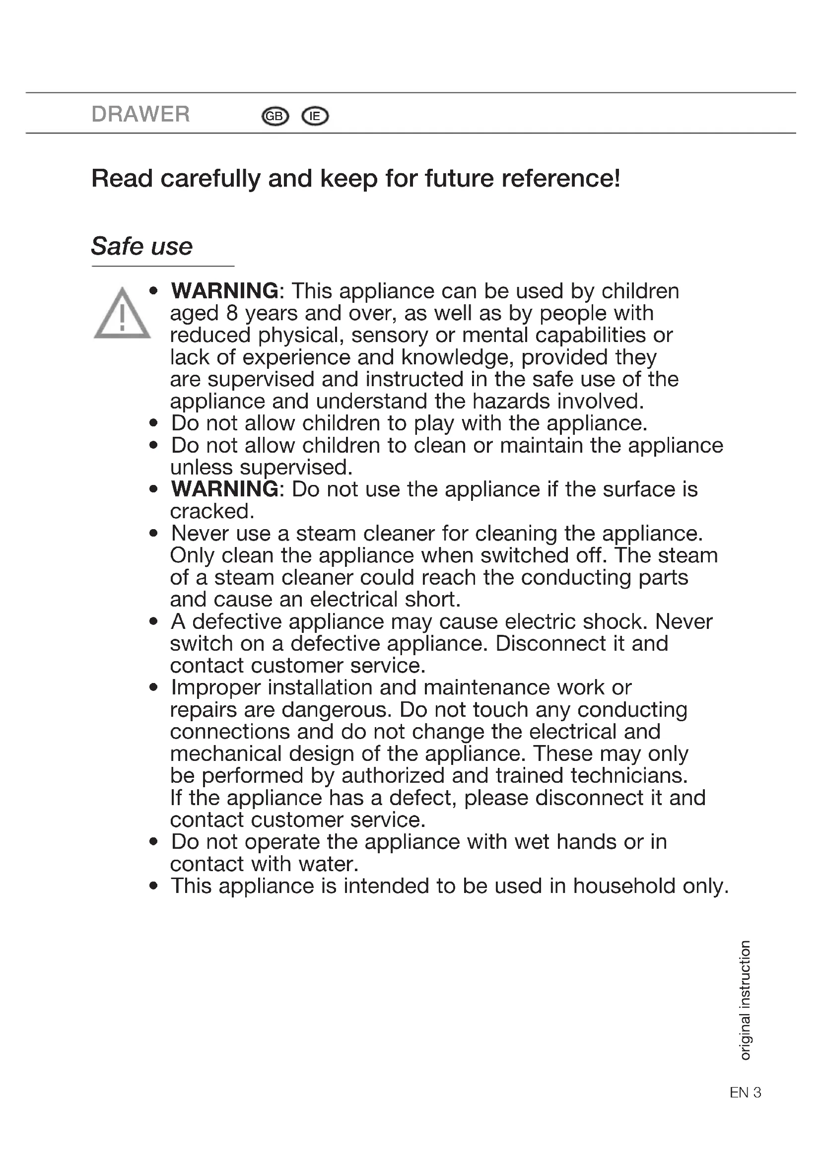 WARNING: Never open the appliance casing. The casing may only be opened by a service technician. - Prior to connecting the drawer, ensure that all cables in your home's electrical system are of sufficient diameter to supply the appliance properly.