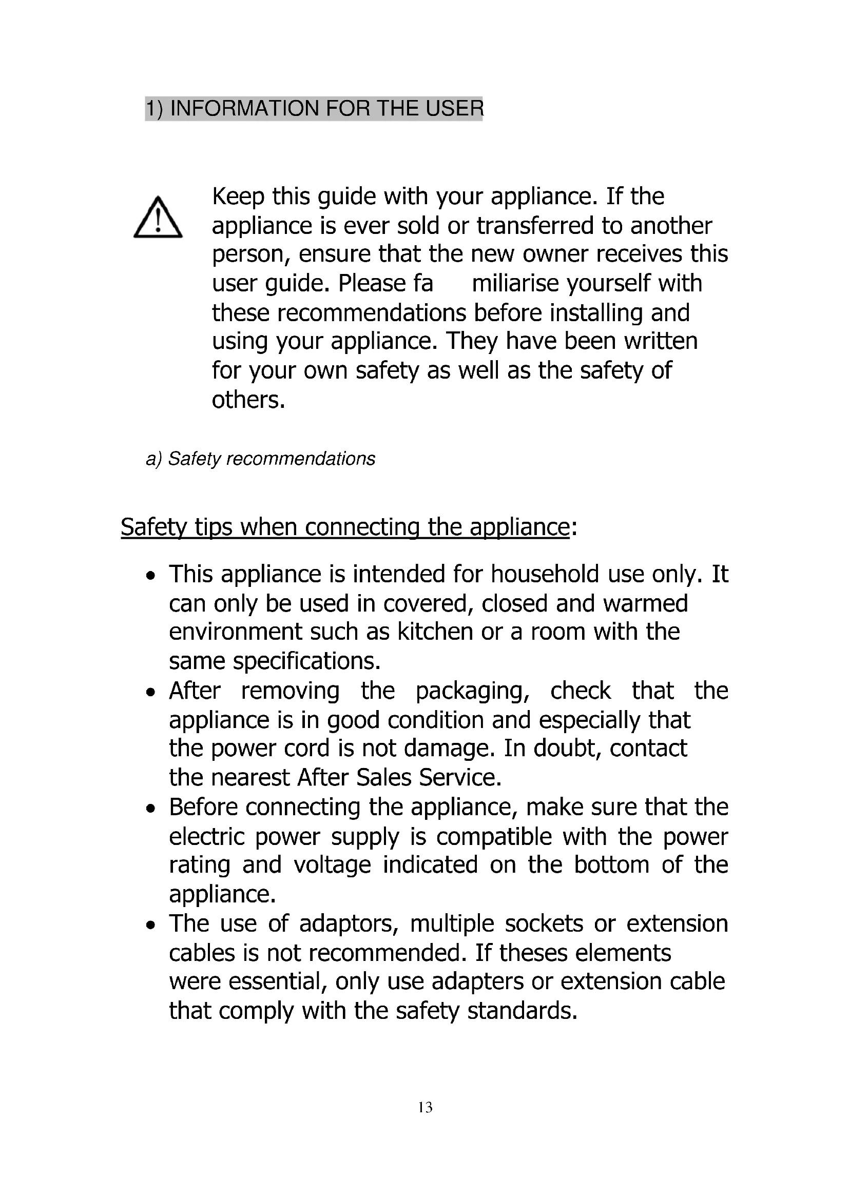 Keep this guide with your appliance. If the appliance is ever sold or transferred to another person, ensure that the new owner receives this user guide. Please fa miliarise yourself with these recommendations before installing and using your appliance. They have been written for your own safety as well as the safety of others. a) Safety recommendations Safety tips when connecting the appliance: This appliance is intended for household use only. It can only be used in covered, closed and warmed environment such as kitchen or a room with the same specifications. After removing the packaging, check that the appliance is in good condition and especially that the power cord is not damage. In doubt, contact the nearest After Sales Service. Before connecting the appliance, make sure that the electric power supply is compatible with the power rating and voltage indicated on the bottom of the appliance. The use of adaptors, multiple sockets or extension cables is not recommended. If theses elements were essential, only use adapters or extension cable that comply with the safety standards.14 This appliance is not intended to be operated by an external timer or separate remote control system. Place the appliance on a dry, stable and smooth surface. Keep the appliance and its cord out of reach of children under 8 years. Children shall not play with the appliance Safety tips when using the appliance: This appliance can be used by children aged from 8 years and above if they have been given supervision or instruction concerning use of the appliance in a safe way and if they understand the hazards involved. This appliance can be used by persons with reduced physical, sensory or mental capabilities or lack of experience and knowledge if they have given supervision or instruction concerning use of the appliance in a safe way and it they understand the hazards involved. The appliance and its accessible parts become hot during the use. Children under the age of 8 years should not use this appliance unless continuous supervision by a responsible adult is given. Keep the power cord away from heated surface. Never pull the power cord when the appliance is used. Do not heat if there is no food inside pans. Never move the raclette when it is functioning. Never use this appliance as a heater.15 The use of accessory attachments not recommended by the appliance’s manufacturer may cause hazard or injury. Cleaning and Maintenance: Unplug the appliance before cleaning and allow the appliance to cool down. The supply cord cannot be replaced. If the cord is damaged the appliance should be scrapped. This product is covered by your distributor. For more details, please refer to the warranty conditions supplied. To protect against electric shock, do not place the base unit of this appliance in water or other liquid. Do not use harsh abrasive cleaners or sharp metal scrapers to clean your raclette. Cleaning and user maintenance shall not be made by children unless they are older than 8 and supervised. Improper use: Use this appliance only for its intended uses as described in manual. The manufacturer shall not be liable for any damage resulting from improper use. The appliance is intended for domestic use only in private housing environments. The use of this appliance in common or professional’s area such as staff kitchen areas in shop, offices and other working environments; by clients in hotels, motels and restaurants or any other shops; by clients in16 kitchen areas or campsite; are not a proper us as defined by the manufacturer. Hot surfaces during use b) Technical Data c) Protecting the environment To remind you that you must dispose of this appliance correctly the symbol shown above appears on the product warning you not to dispose of it with household waste. For further information, contact your local authority or the shop where you bought the product. Model no RAC800