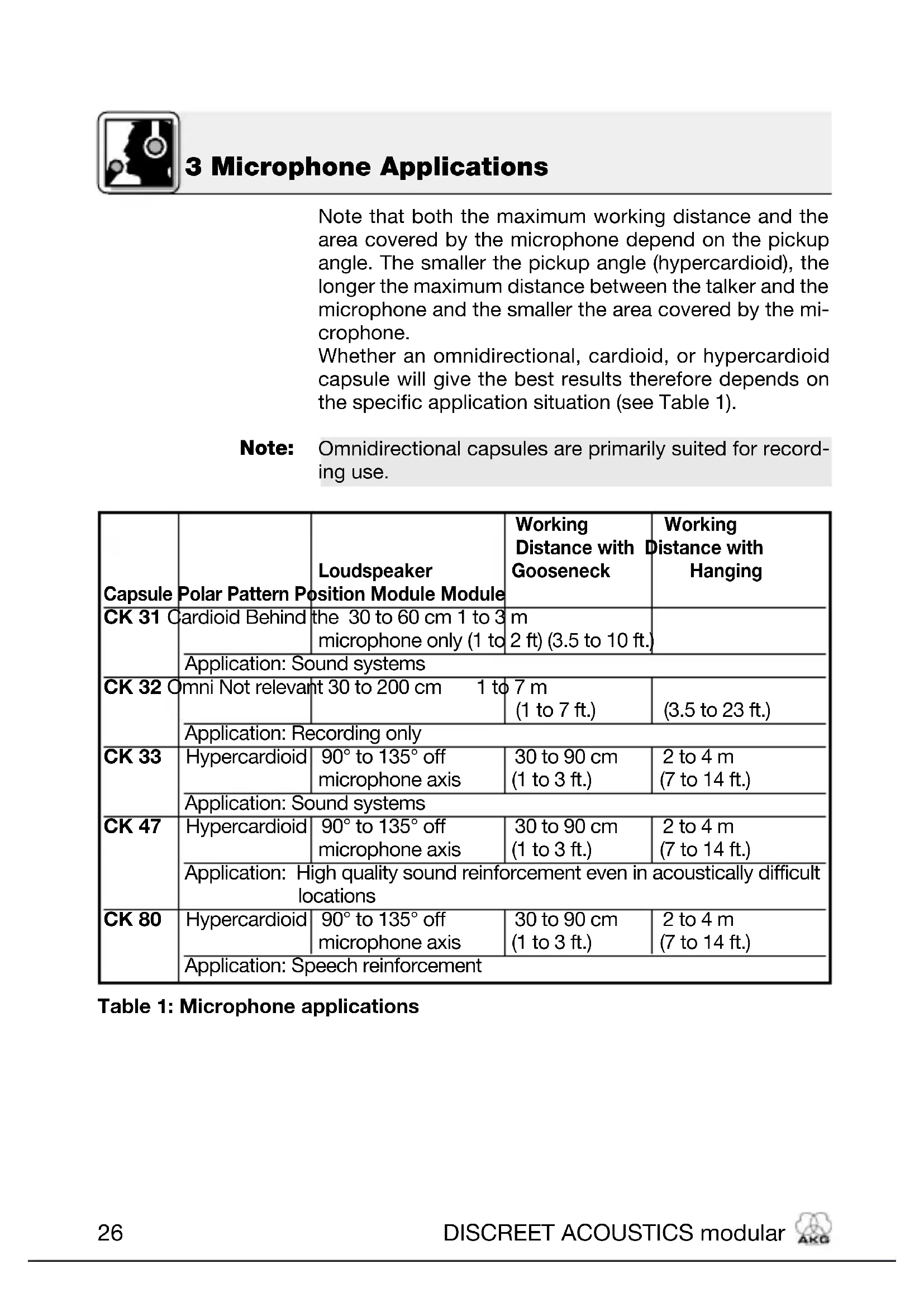 Modules Thank you for purchasing a Discreet Acoustics module! The Discreet Acoustics Modular Series comprises five Capsule Modules and eighteen Installation Modules. All modules are interchangeable so you can put together the ideal Discreet Acoustics Modular microphone for every application at any location. CK 31 (Order no. 2765Z0020): Screw-on cardioid Cap- sule Module. With W 30 foam windscreen. CK 32 (Order no. 2765Z0021): Screw-on omnidirectional Capsule Module. With W 30 foam windscreen. CK 33 (Order no. 2765Z0022): Screw-on hypercardioid Capsule Module. With W 30 foam windscreen. CK 47 (Order no. 2765Z0023): Screw-on hypercardioid Capsule Module. Acoustically equivalent to the proven AKG C 747. With W 70 foam windscreen. CK 80 (Order no. 2765Z0024): Screw-on hypercardioid Capsule Module with speech-optimized frequency re- sponse. With W 80 foam windscreen. 2 Description 1 Safety and Environment
