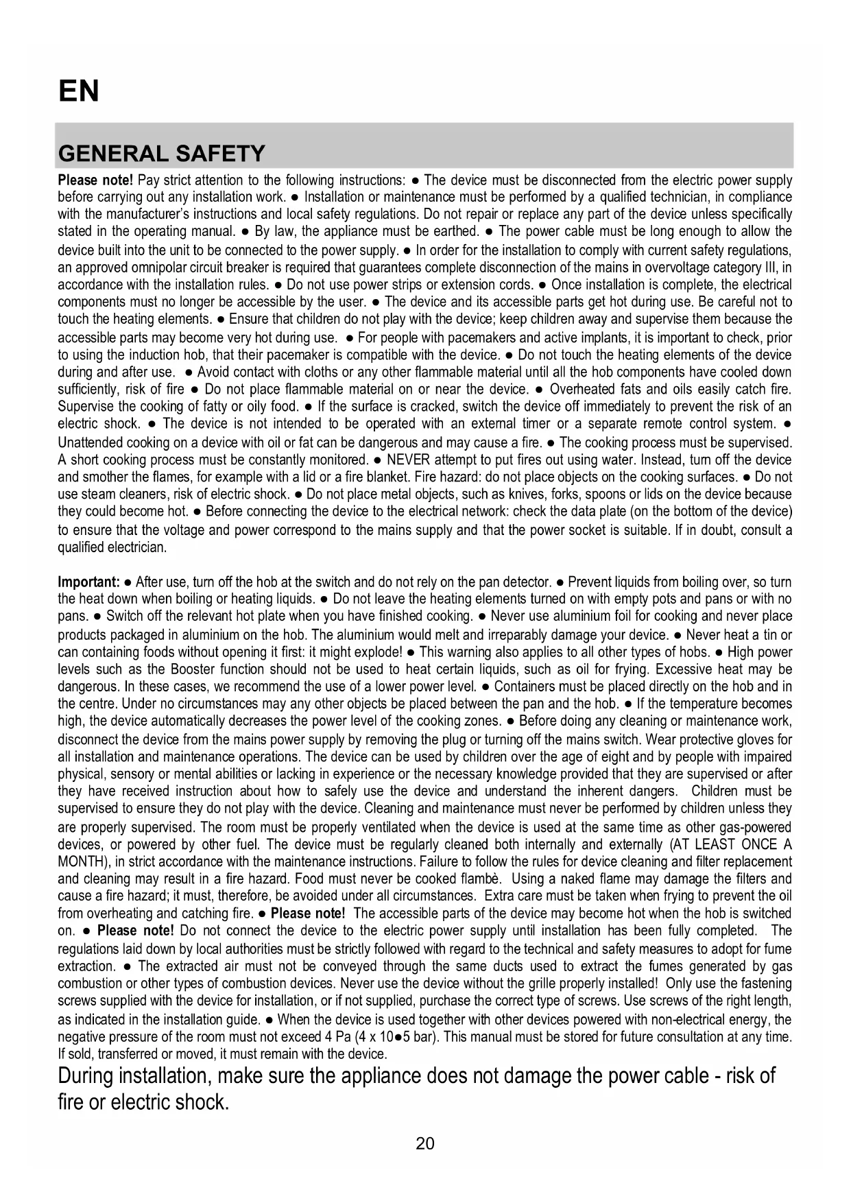 GENERAL SAFETY Please note! Pay strict attention to the following instructions: ● The device must be disconnected from the electric power supply before carrying out any installation work. ● Installation or maintenance must be performed by a qualified technician, in compliance with the manufacturer’s instructions and local safety regulations. Do not repair or replace any part of the device unless specifically stated in the operating manual. ● By law, the appliance must be earthed. ● The power cable must be long enough to allow the device built into the unit to be connected to the power supply. ● In order for the installation to comply with current safety regulations, an approved omnipolar circuit breaker is required that guarantees complete disconnection of the mains in overvoltage category III, in accordance with the installation rules. ● Do not use power strips or extension cords. ● Once installation is complete, the electrical components must no longer be accessible by the user. ● The device and its accessible parts get hot during use. Be careful not to touch the heating elements. ● Ensure that children do not play with the device; keep children away and supervise them because the accessible parts may become very hot during use. ● For people with pacemakers and active implants, it is important to check, prior to using the induction hob, that their pacemaker is compatible with the device. ● Do not touch the heating elements of the device during and after use. ● Avoid contact with cloths or any other flammable material until all the hob components have cooled down sufficiently, risk of fire ● Do not place flammable material on or near the device. ● Overheated fats and oils easily catch fire. Supervise the cooking of fatty or oily food. ● If the surface is cracked, switch the device off immediately to prevent the risk of an electric shock. ● The device is not intended to be operated with an external timer or a separate remote control system. ● Unattended cooking on a device with oil or fat can be dangerous and may cause a fire. ● The cooking process must be supervised. A short cooking process must be constantly monitored. ● NEVER attempt to put fires out using water. Instead, turn off the device and smother the flames, for example with a lid or a fire blanket. Fire hazard: do not place objects on the cooking surfaces. ● Do not use steam cleaners, risk of electric shock. ● Do not place metal objects, such as knives, forks, spoons or lids on the device because they could become hot. ● Before connecting the device to the electrical network: check the data plate (on the bottom of the device) to ensure that the voltage and power correspond to the mains supply and that the power socket is suitable. If in doubt, consult a qualified electrician. Important: ● After use, turn off the hob at the switch and do not rely on the pan detector. ● Prevent liquids from boiling over, so turn the heat down when boiling or heating liquids. ● Do not leave the heating elements turned on with empty pots and pans or with no pans. ● Switch off the relevant hot plate when you have finished cooking. ● Never use aluminium foil for cooking and never place products packaged in aluminium on the hob. The aluminium would melt and irreparably damage your device. ● Never heat a tin or can containing foods without opening it first: it might explode! ● This warning also applies to all other types of hobs. ● High power levels such as the Booster function should not be used to heat certain liquids, such as oil for frying. Excessive heat may be dangerous. In these cases, we recommend the use of a lower power level. ● Containers must be placed directly on the hob and in the centre. Under no circumstances may any other objects be placed between the pan and the hob. ● If the temperature becomes high, the device automatically decreases the power level of the cooking zones. ● Before doing any cleaning or maintenance work, disconnect the device from the mains power supply by removing the plug or turning off the mains switch. Wear protective gloves for all installation and maintenance operations. The device can be used by children over the age of eight and by people with impaired physical, sensory or mental abilities or lacking in experience or the necessary knowledge provided that they are supervised or after they have received instruction about how to safely use the device and understand the inherent dangers. Children must be supervised to ensure they do not play with the device. Cleaning and maintenance must never be performed by children unless they are properly supervised. The room must be properly ventilated when the device is used at the same time as other gas-powered devices, or powered by other fuel. The device must be regularly cleaned both internally and externally (AT LEAST ONCE A MONTH), in strict accordance with the maintenance instructions. Failure to follow the rules for device cleaning and filter replacement and cleaning may result in a fire hazard. Food must never be cooked flambè. Using a naked flame may damage the filters and cause a fire hazard; it must, therefore, be avoided under all circumstances. Extra care must be taken when frying to prevent the oil from overheating and catching fire. ● Please note! The accessible parts of the device may become hot when the hob is switched on. ● Please note! Do not connect the device to the electric power supply until installation has been fully completed. The regulations laid down by local authorities must be strictly followed with regard to the technical and safety measures to adopt for fume extraction. ● The extracted air must not be conveyed through the same ducts used to extract the fumes generated by gas combustion or other types of combustion devices. Never use the device without the grille properly installed! Only use the fastening screws supplied with the device for installation, or if not supp