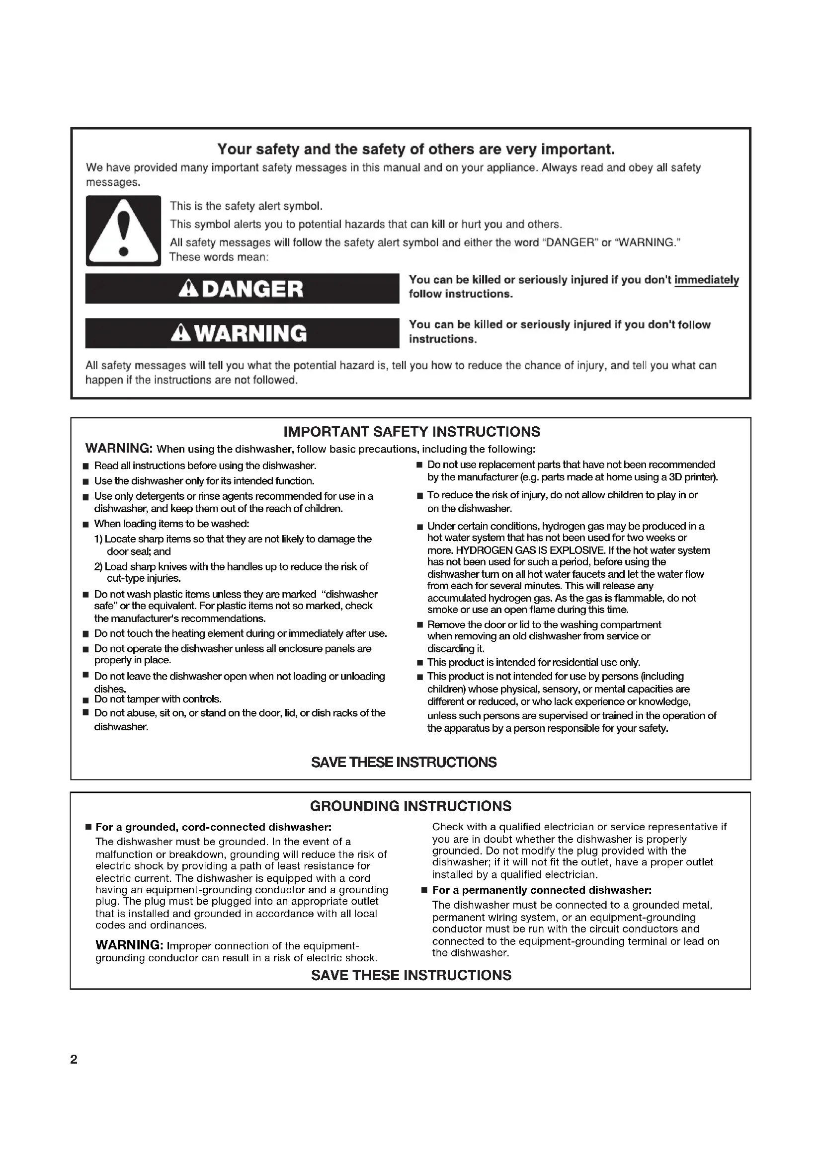 cut-type injuries. Do not wash plastic items unless they are marked “dishwasher safe” or the equivalent. For plastic items not so marked, check the manufacturer's recommendations. Do not touch the heating element during or immediately after use. Do not operate the dishwasher unless all enclosure panels are Do not leave the dishwasher open when not loading or unloading dishes. properly in place. Do not tamper with controls. Do not abuse, sit on, or stand on the door, lid, or dish racks of the dishwasher. Do not use replacement parts that have not been recommended by the manufacturer (e.g. parts made at home using a 3D printer). Under certain conditions, hydrogen gas may be produced in a hot water system that has not been used for two weeks or more. HYDROGEN GAS IS EXPLOSIVE. If the hot water system has not been used for such a period, before using the dishwasher turn on all hot water faucets and let the water flow from each for several minutes. This will release any accumulated hydrogen gas. As the gas is flammable, do not smoke or use an open flame during this time. Remove the door or lid to the washing compartment when removing an old dishwasher from service or discarding it. This product is intended for residential use only. This product is not intended for use by persons (including children) whose physical, sensory, or mental capacities are different or reduced, or who lack experience or knowledge, unless such persons are supervised or trained in the operation of the apparatus by a person responsible for your safety. To reduce the risk of injury, do not allow children to play in or on the dishwasher. GROUNDING INSTRUCTIONS