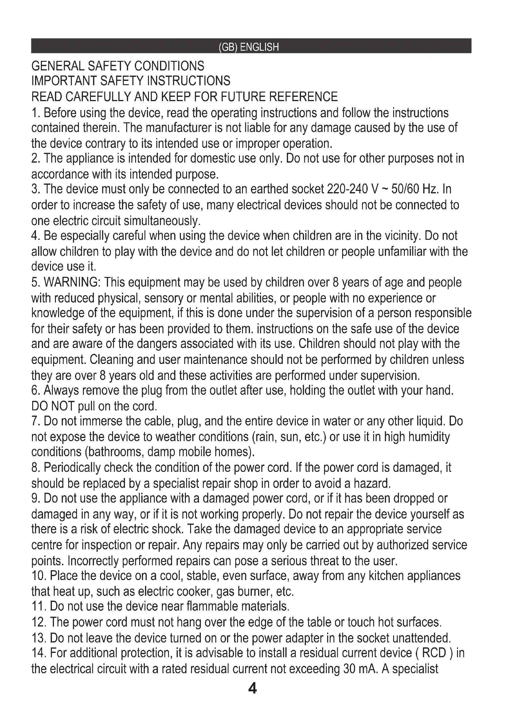 3. The device must only be connected to an earthed socket 220-240 V ~ 50/60 Hz. In