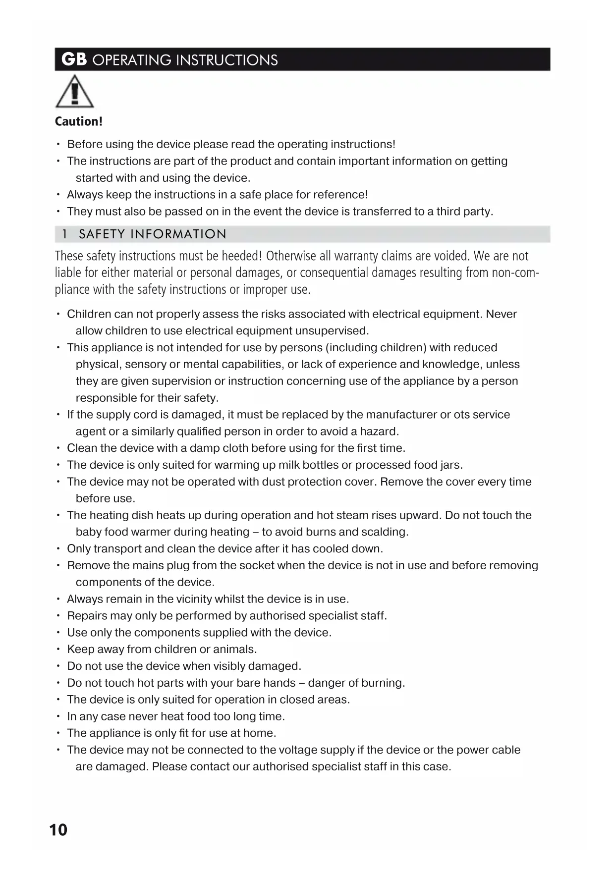- Children can not properly assess the risks associated with electrical equipment. Never allow children to use electrical equipment unsupervised.• This appliance is not intended for use by persons (including children) with reduced physical, sensory or mental capabilities, or lack of experience and knowledge, unless they are given supervision or instruction concerning use of the appliance by a person responsible for their safety.• If the supply cord is damaged, it must be replaced by the manufacturer or ots service agent or a similarly qualified person in order to avoid a hazard.• Clean the device with a damp cloth before using for the first time.• The device is only suited for warming up milk bottles or processed food jars.• The device may not be operated with dust protection cover. Remove the cover every time before use.• The heating dish heats up during operation and hot steam rises upward. Do not touch the baby food warmer during heating – to avoid burns and scalding.• Only transport and clean the device after it has cooled down.• Remove the mains plug from the socket when the device is not in use and before removing components of the device.• Always remain in the vicinity whilst the device is in use.• Repairs may only be performed by authorised specialist staff.• Use only the components supplied with the device.• Keep away from children or animals.• Do not use the device when visibly damaged.• Do not touch hot parts with your bare hands – danger of burning.• The device is only suited for operation in closed areas.• In any case never heat food too long time.• The appliance is only fit for use at home.• The device may not be connected to the voltage supply if the device or the power cable are damaged. Please contact our authorised specialist staff in this case.11