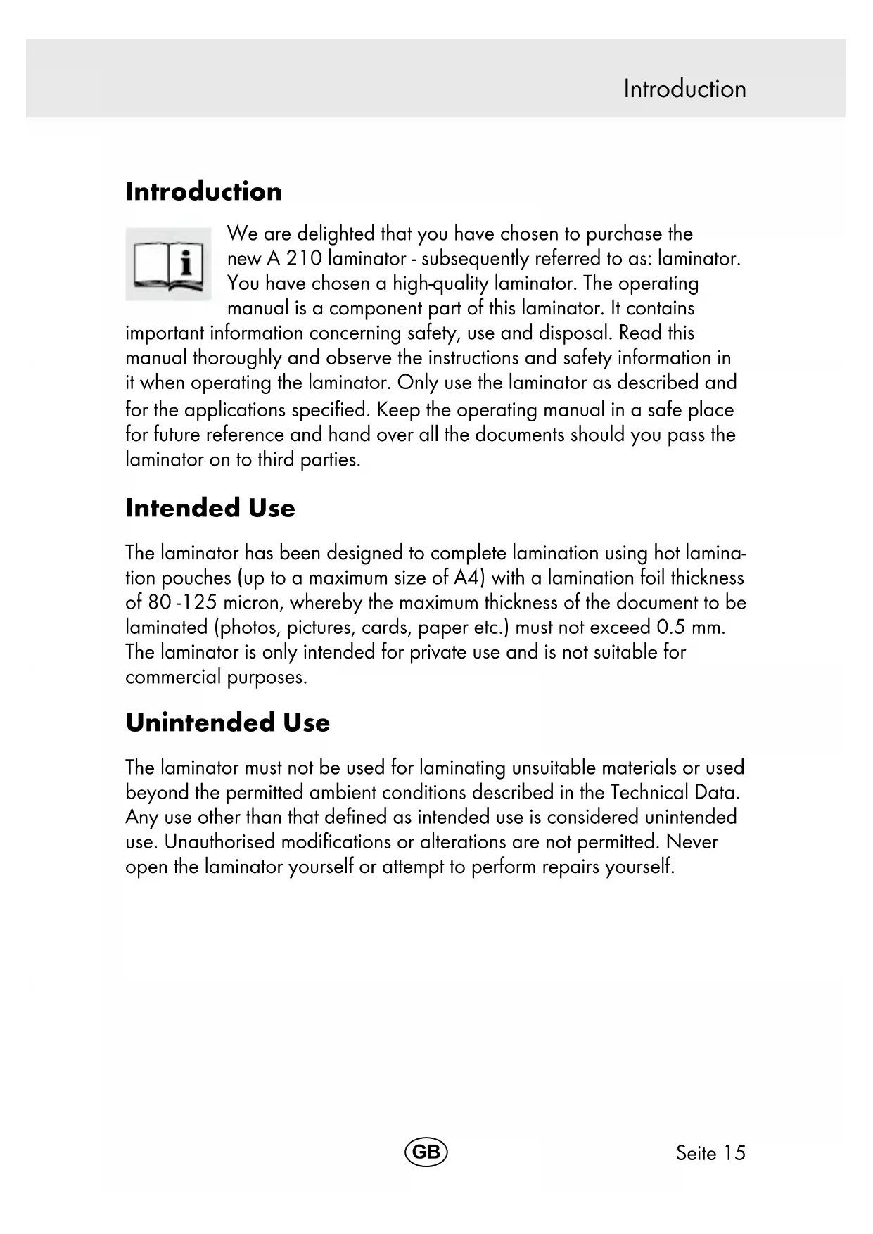 out clean. GSeite 24 Technical Data Technical Data Subject to change without prior notice. Maximum foil thickness 0.5 mm Maximum laminating width 230 mm Maximum laminating thickness 80 -125 micron Warm-up phase 3 - 4 min. Cool down phase Approx. 15 min Laminating speed 300 mm/min Indicator elements Ready to operate: The temperature control indicator lights up red continuously Special features Overheating protection No blistering Power supply 220 - 240 V, 50 Hz, 0.63 A Power consumption 145 W Dimensions 340 x 110 x 60 [mm] Weight 760 g GSeite 25 Declaration of Conformity Declaration of Conformity The CE mark on the laminator conrms conformity. To view the complete Declaration of Conformity, please refer to the free download available on our website: www.go-europe.com Information on Disposal In order to dispose of your laminator, take it to a collection point provided by your local public waste authorities. According to laws on the disposal of electronic and electrical devices, owners are obliged to dispose of old electronic and electrical devices in a separate waste container. The adjacent symbol indicates that the laminator must not be disposed of in normal domestic waste! Packaging materials must be disposed of according to local regulations. Warranty Dear Customer, we are pleased that you have chosen this equipment. In the case of a defect, please return the device together with the receipt and original packing material to the point-of-sale.