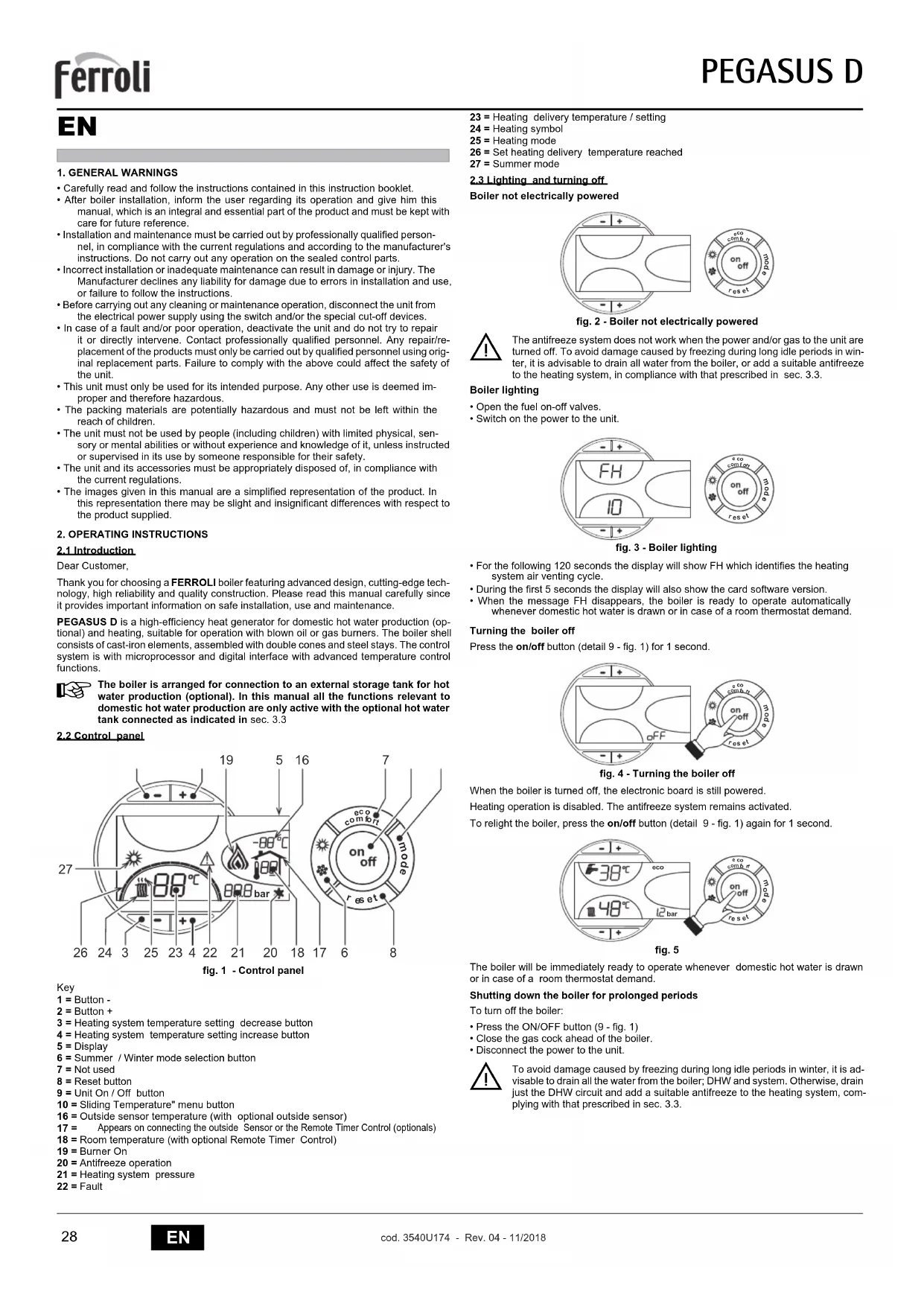 cod. 3540U174 - Rev. 04 - 11/2018EN 1. GENERAL WARNINGS• Carefully read and follow the instructions contained in this instruction booklet.• After boiler installation, inform the user regarding its operation and give him thismanual, which is an integral and essential part of the product and must be kept withcare for future reference.• Installation and maintenance must be carried out by professionally qualified person-nel, in compliance with the current regulations and according to the manufacturer'sinstructions. Do not carry out any operation on the sealed control parts.• Incorrect installation or inadequate maintenance can result in damage or injury. TheManufacturer declines any liability for damage due to errors in installation and use,or failure to follow the instructions.• Before carrying out any cleaning or maintenance operation, disconnect the unit fromthe electrical power supply using the switch and/or the special cut-off devices.• In case of a fault and/or poor operation, deactivate the unit and do not try to repairit or directly intervene. Contact professionally qualified personnel. Any repair/re-placement of the products must only be carried out by qualified personnel using orig-inal replacement parts. Failure to comply with the above could affect the safety ofthe unit.• This unit must only be used for its intended purpose. Any other use is deemed im-proper and therefore hazardous.• The packing materials are potentially hazardous and must not be left within thereach of children.• The unit must not be used by people (including children) with limited physical, sen-sory or mental abilities or without experience and knowledge of it, unless instructedor supervised in its use by someone responsible for their safety.• The unit and its accessories must be appropriately disposed of, in compliance withthe current regulations.• The images given in this manual are a simplified representation of the product. Inthis representation there may be slight and insignificant differences with respect tothe product supplied.2. OPERATING INSTRUCTIONS2.1 IntroductionDear Customer, Thank you for choosing a FERROLI boiler featuring advanced design, cutting-edge tech- nology, high reliability and quality construction. Please read this manual carefully sinceit provides important information on safe installation, use and maintenance.PEGASUS D is a high-efficiency heat generator for domestic hot water production (op-tional) and heating, suitable for operation with blown oil or gas burners. The boiler shellconsists of cast-iron elements, assembled with double cones and steel stays. The controlsystem is with microprocessor and digital interface with advanced temperature controlfunctions. The boiler is arranged for connection to an external storage tank for hotwater production (optional). In this manual all the functions relevant todomestic hot water production are only active with the optional hot watertank connected as indicated in sec. 3.32.2 Control panelfig. 1 - Control panel Key 1 = Button -2 = Button +3 = Heating system temperature setting decrease button4 = Heating system temperature setting increase button5 = Display6 = Summer / Winter mode selection button7 = Not used8 = Reset button9 = Unit On / Off button10 = Sliding Temperature" menu button16 = Outside sensor temperature (with optional outside sensor) 17 = Appears on connecting the outside Sensor or the Remote Timer Control (optionals)18 = Room temperature (with optional Remote Timer Control)19 = Burner On20 = Antifreeze operation21 = Heating system pressure22 = Fault23 = Heating delivery temperature / setting24 = Heating symbol25 = Heating mode26 = Set heating delivery temperature reached27 = Summer mode2.3 Lighting and turning offBoiler not electrically poweredfig. 2 - Boiler not electrically powered The antifreeze system does not work when the power and/or gas to the unit areturned off. To avoid damage caused by freezing during long idle periods in win-ter, it is advisable to drain all water from the boiler, or add a suitable antifreezeto the heating system, in compliance with that prescribed in sec. 3.3.Boiler lighting• Open the fuel on-off valves.• Switch on the power to the unit.fig. 3 - Boiler lighting• For the following 120 seconds the display will show FH which identifies the heatingsystem air venting cycle.• During the first 5 seconds the display will also show the card software version.• When the message FH disappears, the boiler is ready to operate automaticallywhenever domestic hot water is drawn or in case of a room thermostat demand.Turning the boiler off Press the on/off button (detail 9 - fig. 1) for 1 second. fig. 4 - Turning the boiler offWhen the boiler is turned off, the electronic board is still powered.Heating operation is disabled. The antifreeze system remains activated. To relight the boiler, press the on/off button (detail 9 - fig. 1) again for 1 second. fig. 5The boiler will be immediately ready to operate whenever domestic hot water is drawnor in case of a room thermostat demand.Shutting down the boiler for prolonged periodsTo turn off the boiler:• Press the ON/OFF button (9 - fig. 1)• Close the gas cock ahead of the boiler.• Disconnect the power to the unit. To avoid damage caused by freezing during long idle periods in winter, it is ad-visable to drain all the water from the boiler; DHW and system. Otherwise, drainjust the DHW circuit and add a suitable antifreeze to the heating system, com-plying with that prescribed in sec. 3.3.