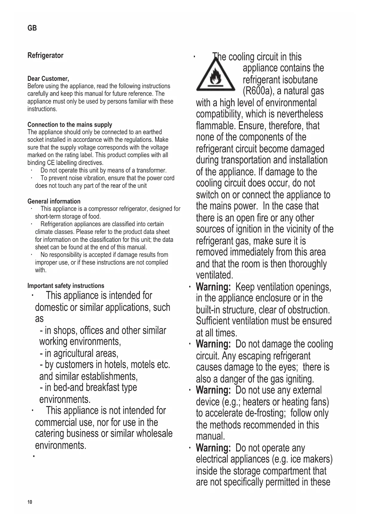 ∙ The cooling circuit in this appliance contains the refrigerant isobutane (R600a), a natural gas with a high level of environmental compatibility, which is nevertheless ammable. Ensure, therefore, that none of the components of the refrigerant circuit become damaged during transportation and installation of the appliance. If damage to the cooling circuit does occur, do not switch on or connect the appliance to the mains power. In the case that there is an open re or any other sources of ignition in the vicinity of the refrigerant gas, make sure it is removed immediately from this area and that the room is then thoroughly ventilated. ∙ Warning: Keep ventilation openings, in the appliance enclosure or in the built-in structure, clear of obstruction. Sufcient ventilation must be ensured at all times. ∙ Warning: Do not damage the cooling circuit. Any escaping refrigerant causes damage to the eyes; there is also a danger of the gas igniting. ∙ Warning: Do not use any external device (e.g.; heaters or heating fans) to accelerate de-frosting; follow only the methods recommended in this manual. ∙ Warning: Do not operate any electrical appliances (e.g. ice makers) inside the storage compartment that are not specically permitted in these GB11 142 x 208 mm instructions. ∙ Before it is connected to the mains power, the unit must be thoroughly checked for transport damage, including its power cord. In the event of any such damage being found, the appliance must not be connected to the mains. ∙ When positioning the appliance, ensure the supply cord is not trapped or damaged. ∙ Do not locate multiple portable socket- outlets or portable power supplies at the rear of the appliance. ∙ This appliance is not designed for the storage of explosive substances such as aerosol cans with a ammable propellant. ∙ If the unit is sold, handed over to a third party or disposed of at a suitable recycling facility, attention must be drawn to the presence of the insulation agent ‘cyclopenthane’ as well as to the refrigerant R600a. For additional information on correct recycling please refer to the section Disposal. ∙ In order to comply with safety regulations and to avoid hazards, any repairs or modications to this unit must be carried out by our authorised service personnel, including the replacement of the power cord. ∙ This appliance may be used by children (at least 8 years of age) and by persons with reduced physical, sensory or mental capabilities, or lacking experience and knowledge, provided they have been given supervision or instruction concerning the use of the appliance and fully understand all dangers and safety precautions involved. ∙ Children aged from 3 to 8 years are allowed to load and unload refrigerating appliances. ∙ Children must not be permitted to play with the appliance. ∙ Children must not be permitted to carry out any cleaning or maintenance work on the appliance. ∙ For frequent cleaning we recommend the use of warm water with some mild detergent. For detailed information on cleaning the appliance, please refer to the section De-frosting and cleaning. To avoid contamination of food respect the following instructions: ∙ Opening the door for long periods can cause a signicant increase of the temperature in the compartments of the appliance. ∙ Clean regularly surfaces that can come in contact with food and accessible drainage systems. ∙ Store raw meat and sh in suitable containers in the refrigerator so that it is not in contact with or drip onto other food. ∙ If the refrigerating appliance is left empty for long periods switch off, defrost, clean, dry and leave the door open to prevent mould developing within the appliance.12 142 x 208 mm Storing food ∙ The temperatures inside the refrigerator cabinet and cold storage compartment depend mainly on the ambient temperature, the temperature control setting and the amount of food stored. Cold storage compartment: ∙ The cold storage compartment is specically designed for short-term storage of fresh meat, sh and poultry. Main cabinet ∙ Different areas of the refrigerator cabinet are affected differently by the cooling effect. The warmest area is around the door in the higher part of the cabinet, the coldest around the rear wall and in the lower part of the cabinet. ∙ The food should therefore be stored as follows: ∙ On main cabinet shelves (from top to bottom): bakery items, ready meals, dairy products, meat, sh and cold meats/sausages. ∙ In the door (from top to bottom): butter, cheese, eggs, tubes (eg mustard), small bottles, large bottles, milk and fruit-juice tetra-packs. ∙ To prevent the risk of personal injury or damage to the unit, it must only be transported while in its original packaging. ∙ Caution: Keep any packaging materials well away from children: there is a risk of suffocation. ∙ The ice removed from the unit during de-frosting is not suitable for human consumption. ∙ The power cord should be regularly examined for any signs of damage. In the event of such damage being found, the appliance must no longer be used. ∙ To avoid the risk of re, do not place any thermo-electric appliances on top of the unit. Do not place liquid containers on top of the unit, to prevent any leaking or escaping liquid damaging the electrical insulation. ∙ This unit is designed for storing food only. ∙ Alcoholic substances may be stored only in properly sealed containers and in upright positions. ∙ Do not store any glass bottles containing carbonated or other freezable liquids in the unit: such bottles may burst during the freezing process. ∙ To avoid the risk of food poisoning, do not consume food after its storage time has expired. Thawed foods must not be frozen a second time. ∙ Do not lean or put undue weight on the shelves, compartments, door etc. ∙ Protect the inside of the refrigerator at all times from open ames and any other sources of ignition. ∙ Remove the plug from the w