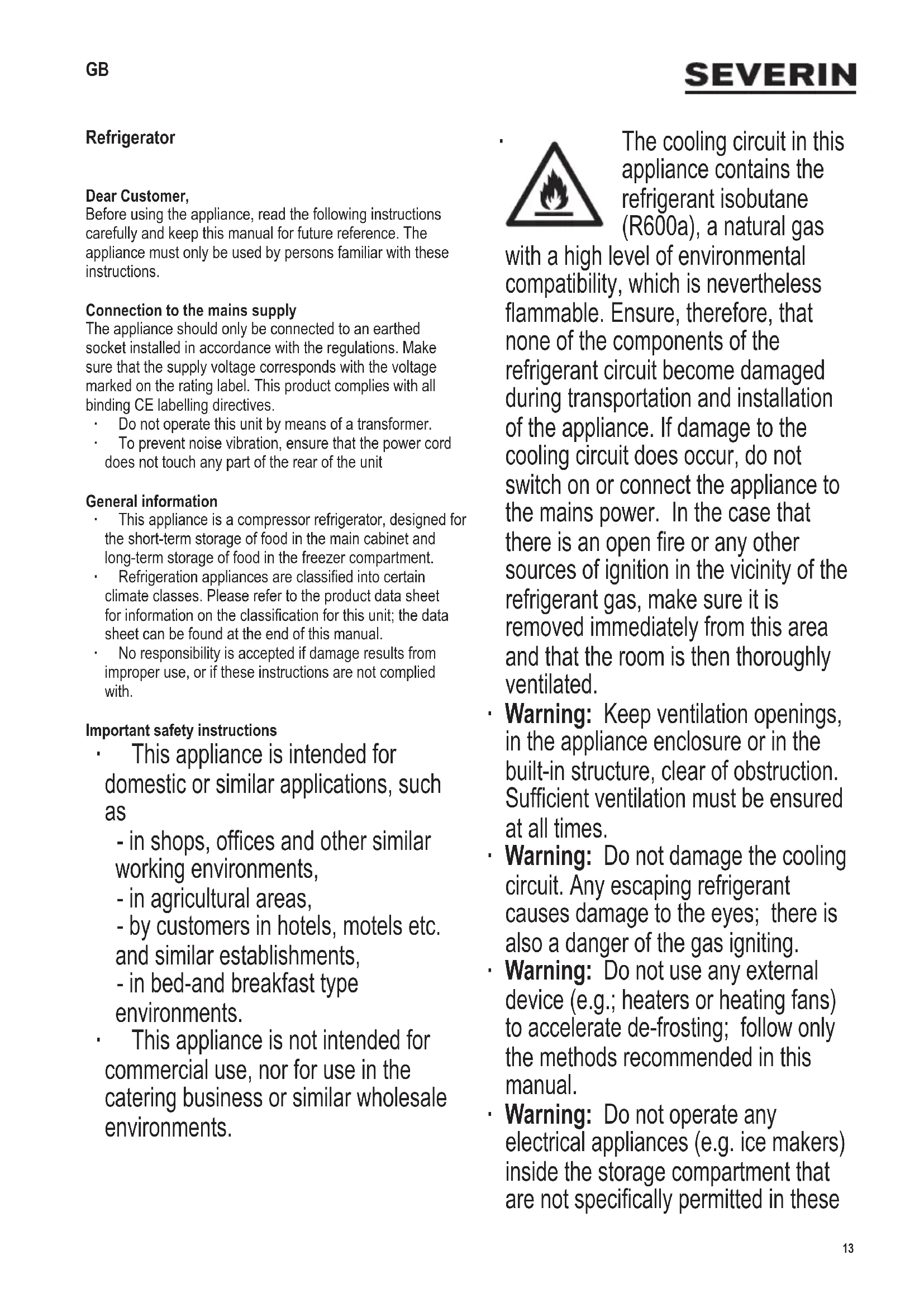 The cooling circuit in this appliance contains the refrigerant isobutane (R600a), a natural gas with a high level of environmental compatibility, which is nevertheless ammable. Ensure, therefore, that none of the components of the refrigerant circuit become damaged during transportation and installation of the appliance. If damage to the cooling circuit does occur, do not switch on or connect the appliance to the mains power. In the case that there is an open re or any other sources of ignition in the vicinity of the refrigerant gas, make sure it is removed immediately from this area and that the room is then thoroughly ventilated. ∙ Warning: Keep ventilation openings, in the appliance enclosure or in the built-in structure, clear of obstruction. Sufcient ventilation must be ensured at all times. ∙ Warning: Do not damage the cooling circuit. Any escaping refrigerant causes damage to the eyes; there is also a danger of the gas igniting. ∙ Warning: Do not use any external device (e.g.; heaters or heating fans) to accelerate de-frosting; follow only the methods recommended in this manual. ∙ Warning: Do not operate any electrical appliances (e.g. ice makers) inside the storage compartment that are not specically permitted in these GB14 142 x 208 mm instructions. ∙ Before it is connected to the mains power, the unit must be thoroughly checked for transport damage, including its power cord. In the event of any such damage being found, the appliance must not be connected to the mains. ∙ When positioning the appliance, ensure the supply cord is not trapped or damaged. ∙ Do not locate portable multible socket- outlets or portable power supplies at the rear oft he appliance. ∙ This appliance is not designed for the storage of explosive substances such as aerosol cans with a ammable propellant. ∙ If the unit is sold, handed over to a third party or disposed of at a suitable recycling facility, attention must be drawn to the presence of the insulation agent ‘cyclopenthane’ as well as to the refrigerant R600a. ∙ In order to comply with safety regulations and to avoid hazards, any repairs or modications to this unit must be carried out by our authorised service personnel, including the replacement of the power cord. ∙ This appliance may be used by children (at least 8 years of age) and by persons with reduced physical, sensory or mental capabilities, or lacking experience and knowledge, provided they have been given supervision or instruction concerning the use of the appliance and fully understand all dangers and safety precautions involved. ∙ Children aged from 3 to 8 years are allowed to load and unload refrigerating appliances. ∙ Children must not be permitted to play with the appliance. ∙ Children must not be permitted to carry out any cleaning or maintenance work on the appliance. ∙ For frequent cleaning we recommend the use of warm water with some mild detergent. For detailed information on cleaning the appliance, please refer to the section De-frosting and cleaning. ∙ For detailed information on replacing the LED, please refer to the section Interior lighting. To avoid contamination of food respect the following instructions: ∙ Opening the door for long periods can cause a signicant increase of the temperature in the compartments of the appliance. ∙ Clean regularly surfaces that can come in contact with food and accessible drainage systems. ∙ Store raw meat and sh in suitable containers in the refrigerator so that it is not in contact with or drip onto other food. ∙ If the refrigerating appliance is left empty for long periods switch off, defrost, clean, dry and leave the door open to prevent mould developing within the appliance.15 142 x 208 mm Storing food ∙ Different areas of the refrigerator cabinet are affected differently by the cooling effect. The warmest area is around the door in the higher part of the cabinet, the coldest around the rear wall and in the lower part of the cabinet. ∙ The food should therefore be stored as follows: ∙ On main cabinet shelves (from top to bottom): bakery items, ready meals, dairy products, meat, sh and cold meats/sausages. ∙ In the vegetable compartment: vegetables, salad and fruit. ∙ In the door (from top to bottom): butter, cheese, eggs, tubes (eg mustard), small bottles, large bottles, milk and fruit-juice tetra-packs. ∙ To prevent the risk of personal injury or damage to the unit, it must only be transported while in its original packaging. ∙ Caution: Keep any packaging materials well away from children: there is a risk of suffocation. ∙ The ice removed from the unit during de-frosting is not suitable for human consumption. ∙ The power cord should be regularly examined for any signs of damage. In the event of such damage being found, the appliance must no longer be used. ∙ To avoid the risk of re, do not place any thermo-electric appliances on top of the unit. Do not place liquid containers on top of the unit, to prevent any leaking or escaping liquid damaging the electrical insulation. ∙ This unit is designed for storing food only. ∙ Alcoholic substances may be stored only in properly sealed containers and in upright positions. ∙ Do not store any glass bottles containing carbonated or other freezable liquids in the unit: such bottles may burst during the freezing process. ∙ To avoid the risk of food poisoning, do not consume food after its storage time has expired. Thawed foods must not be frozen a second time. ∙ Do not lean or put undue weight on the shelves, compartments, door etc. ∙ Protect the inside of the refrigerator at all times from open ames and any other sources of ignition. ∙ Remove the plug from the wall socket - in case of any malfunction, - before de-frosting, - during cleaning, - before maintenance or repair work is carried out. ∙ When removing the plug from the wall socket, never pull on the power cord; always grip the plug itself. ∙ We reserve the righ