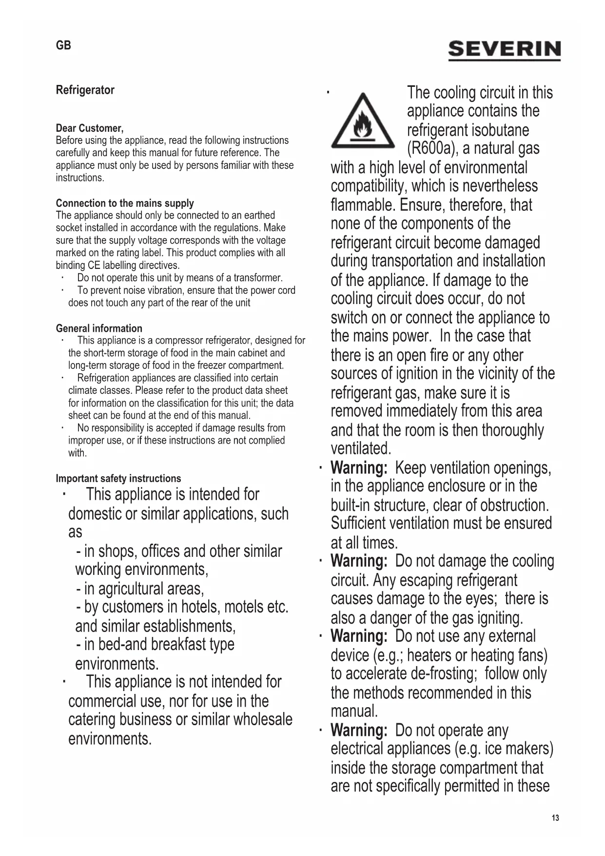 The cooling circuit in this appliance contains the refrigerant isobutane (R600a), a natural gas with a high level of environmental compatibility, which is nevertheless ammable. Ensure, therefore, that none of the components of the refrigerant circuit become damaged during transportation and installation of the appliance. If damage to the cooling circuit does occur, do not switch on or connect the appliance to the mains power. In the case that there is an open re or any other sources of ignition in the vicinity of the refrigerant gas, make sure it is removed immediately from this area and that the room is then thoroughly ventilated. ∙ Warning: Keep ventilation openings, in the appliance enclosure or in the built-in structure, clear of obstruction. Sufcient ventilation must be ensured at all times. ∙ Warning: Do not damage the cooling circuit. Any escaping refrigerant causes damage to the eyes; there is also a danger of the gas igniting. ∙ Warning: Do not use any external device (e.g.; heaters or heating fans) to accelerate de-frosting; follow only the methods recommended in this manual. ∙ Warning: Do not operate any electrical appliances (e.g. ice makers) inside the storage compartment that are not specically permitted in these GB14 142 x 208 mm instructions. ∙ Before it is connected to the mains power, the unit must be thoroughly checked for transport damage, including its power cord. In the event of any such damage being found, the appliance must not be connected to the mains. ∙ When positioning the appliance, ensure the supply cord is not trapped or damaged. ∙ Do not locate portable multible socket- outlets or portable power supplies at the rear oft he appliance. ∙ This appliance is not designed for the storage of explosive substances such as aerosol cans with a ammable propellant. ∙ If the unit is sold, handed over to a third party or disposed of at a suitable recycling facility, attention must be drawn to the presence of the insulation agent ‘cyclopenthane’ as well as to the refrigerant R600a. ∙ In order to comply with safety regulations and to avoid hazards, any repairs or modications to this unit must be carried out by our authorised service personnel, including the replacement of the power cord. ∙ This appliance may be used by children (at least 8 years of age) and by persons with reduced physical, sensory or mental capabilities, or lacking experience and knowledge, provided they have been given supervision or instruction concerning the use of the appliance and fully understand all dangers and safety precautions involved. ∙ Children aged from 3 to 8 years are allowed to load and unload refrigerating appliances. ∙ Children must not be permitted to play with the appliance. ∙ Children must not be permitted to carry out any cleaning or maintenance work on the appliance. ∙ For frequent cleaning we recommend the use of warm water with some mild detergent. For detailed information on cleaning the appliance, please refer to the section De-frosting and cleaning. ∙ For detailed information on replacing the LED, please refer to the section Interior lighting. To avoid contamination of food respect the following instructions: ∙ Opening the door for long periods can cause a signicant increase of the temperature in the compartments of the appliance. ∙ Clean regularly surfaces that can come in contact with food and accessible drainage systems. ∙ Store raw meat and sh in suitable containers in the refrigerator so that it is not in contact with or drip onto other food. ∙ If the refrigerating appliance is left empty for long periods switch off, defrost, clean, dry and leave the door open to prevent mould developing within the appliance.15 142 x 208 mm Storing food ∙ Different areas of the refrigerator cabinet are affected differently by the cooling effect. The warmest area is around the door in the higher part of the cabinet, the coldest around the rear wall and in the lower part of the cabinet. ∙ The food should therefore be stored as follows: ∙ On main cabinet shelves (from top to bottom): bakery items, ready meals, dairy products, meat, sh and cold meats/sausages. ∙ In the vegetable compartment: vegetables, salad and fruit. ∙ In the door (from top to bottom): butter, cheese, eggs, tubes (eg mustard), small bottles, large bottles, milk and fruit-juice tetra-packs. ∙ To prevent the risk of personal injury or damage to the unit, it must only be transported while in its original packaging. ∙ Caution: Keep any packaging materials well away from children: there is a risk of suffocation. ∙ The ice removed from the unit during de-frosting is not suitable for human consumption. ∙ The power cord should be regularly examined for any signs of damage. In the event of such damage being found, the appliance must no longer be used. ∙ To avoid the risk of re, do not place any thermo-electric appliances on top of the unit. Do not place liquid containers on top of the unit, to prevent any leaking or escaping liquid damaging the electrical insulation. ∙ This unit is designed for storing food only. ∙ Alcoholic substances may be stored only in properly sealed containers and in upright positions. ∙ Do not store any glass bottles containing carbonated or other freezable liquids in the unit: such bottles may burst during the freezing process. ∙ To avoid the risk of food poisoning, do not consume food after its storage time has expired. Thawed foods must not be frozen a second time. ∙ Do not lean or put undue weight on the shelves, compartments, door etc. ∙ Protect the inside of the refrigerator at all times from open ames and any other sources of ignition. ∙ Remove the plug from the wall socket - in case of any malfunction, - before de-frosting, - during cleaning, - before maintenance or repair work is carried out. ∙ When removing the plug from the wall socket, never pull on the power cord; always grip the plug itself. ∙ We reserve the righ