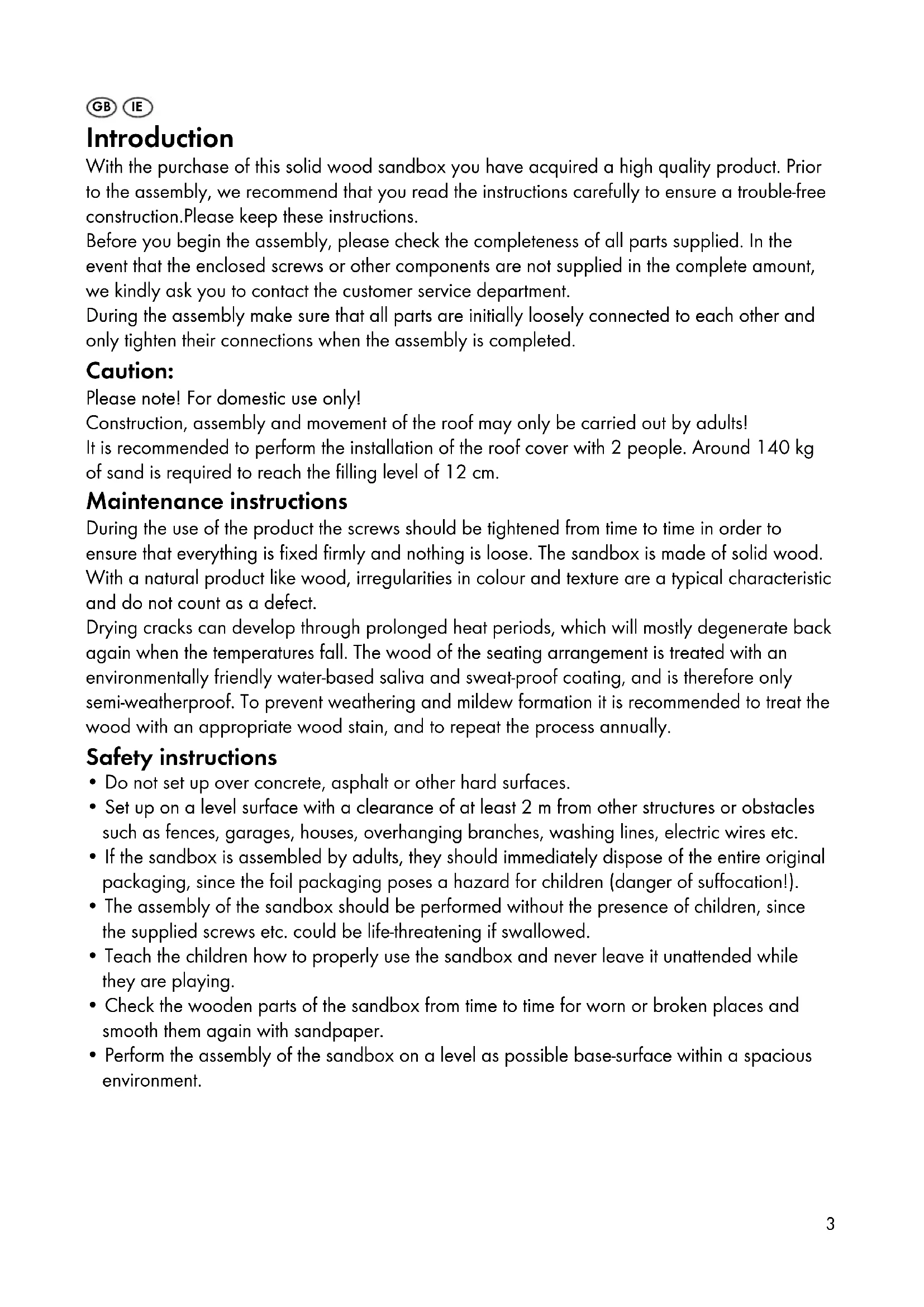 Klappen Sie vor dem Lesen die Seite mit den Abbildungen aus und machen Sie sich anschließend mit allen Funktionen des Gerätes vertraut. GB / IE Operation and Safety Notes..............................................................................................Page 3 DK Drifts- og sikkerhedsanvisninger.........................................................................................Side 5 FR / BE Instructions d‘utilisation et de sécurité................................................................................Page 7 NL / BE Bedieningsen veiligheidsinstructies ....................................................................................Page 9 DE / AT / CH Bedienungs- und Sicherheitshinweise.................................................................................Seite 1123 Introduction With the purchase of this solid wood sandbox you have acquired a high quality product. Prior to the assembly, we recommend that you read the instructions carefully to ensure a trouble-free construction.Please keep these instructions. Before you begin the assembly, please check the completeness of all parts supplied. In the event that the enclosed screws or other components are not supplied in the complete amount, we kindly ask you to contact the customer service department. During the assembly make sure that all parts are initially loosely connected to each other and only tighten their connections when the assembly is completed. Caution: Please note! For domestic use only! Construction, assembly and movement of the roof may only be carried out by adults! It is recommended to perform the installation of the roof cover with 2people. Around 140kg of sand is required to reach the filling level of 12 cm. Maintenance instructions During the use of the product the screws should be tightened from time to time in order to ensure that everything is fixed firmly and nothing is loose. The sandbox is made of solid wood. With a natural product like wood, irregularities in colour and texture are a typical characteristic and do not count as a defect. Drying cracks can develop through prolonged heat periods, which will mostly degenerate back again when the temperatures fall. The wood of the seating arrangement is treated with an environmentally friendly water-based saliva and sweat-proof coating, and is therefore only semi-weatherproof. To prevent weathering and mildew formation it is recommended to treat the wood with an appropriate wood stain, and to repeat the process annually. Safety instructions