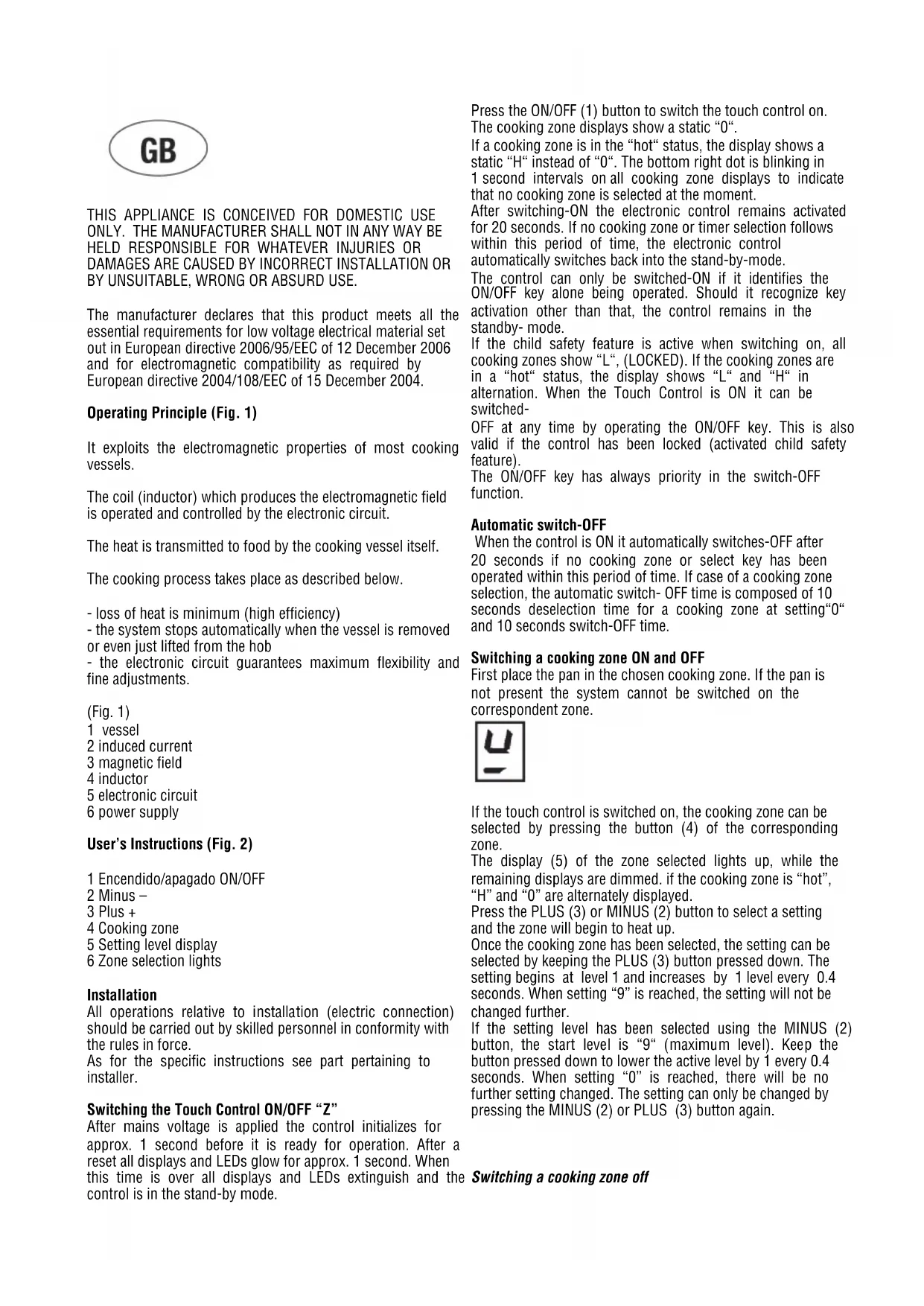 DAMAGES ARE CAUSED BY INCORRECT INSTALLATION OR BY UNSUITABLE, WRONG OR ABSURD USE. The manufacturer declares that this product meets all the essential requirements for low voltage electrical material set out in European directive 2006/95/EEC of 12 December 2006 and for electromagnetic compatibility as required by European directive 2004/108/EEC of 15 December 2004. Operating Principle (Fig. 1) It exploits the electromagnetic properties of most cooking vessels. The coil (inductor) which produces the electromagnetic field is operated and controlled by the electronic circuit. The heat is transmitted to food by the cooking vessel itself. The cooking process takes place as described below. - loss of heat is minimum (high efficiency) - the system stops automatically when the vessel is removed or even just lifted from the hob - the electronic circuit guarantees maximum flexibility and fine adjustments. (Fig. 1) 1 vessel 2 induced current 3 magnetic field 4 inductor 5 electronic circuit 6 power supply User’s Instructions (Fig. 2) 1 Encendido/apagado ON/OFF 2 Minus – 3 Plus + 4 Cooking zone 5 Setting level display 6 Zone selection lights Installation All operations relative to installation (electric connection) should be carried out by skilled personnel in conformity with the rules in force. As for the specific instructions see part pertaining to installer. Switching the Touch Control ON/OFF “Z” After mains voltage is applied the control initializes for approx. 1 second before it is ready for operation. After a reset all displays and LEDs glow for approx. 1 second. When this time is over all displays and LEDs extinguish and the control is in the stand-by mode. Press the ON/OFF (1) button to switch the touch control on. The cooking zone displays show a static “0“. If a cooking zone is in the “hot“ status, the display shows a static “H“ instead of “0“. The bottom right dot is blinking in 1 second intervals on all cooking zone displays to indicate that no cooking zone is selected at the moment. After switching-ON the electronic control remains activated for 20 seconds. If no cooking zone or timer selection follows within this period of time, the electronic control automatically switches back into the stand-by-mode. The control can only be switched-ON if it identifies the ON/OFF key alone being operated. Should it recognize key activation other than that, the control remains in the standby- mode. If the child safety feature is active when switching on, all cooking zones show “L“, (LOCKED). If the cooking zones are in a “hot“ status, the display shows “L“ and “H“ in alternation. When the Touch Control is ON it can be switched- OFF at any time by operating the ON/OFF key. This is also valid if the control has been locked (activated child safety feature). The ON/OFF key has always priority in the switch-OFF function. Automatic switch-OFF When the control is ON it automatically switches-OFF after 20 seconds if no cooking zone or select key has been operated within this period of time. If case of a cooking zone selection, the automatic switch- OFF time is composed of 10 seconds deselection time for a cooking zone at setting“0“ and 10 seconds switch-OFF time. Switching a cooking zone ON and OFF First place the pan in the chosen cooking zone. If the pan is not present the system cannot be switched on the correspondent zone.