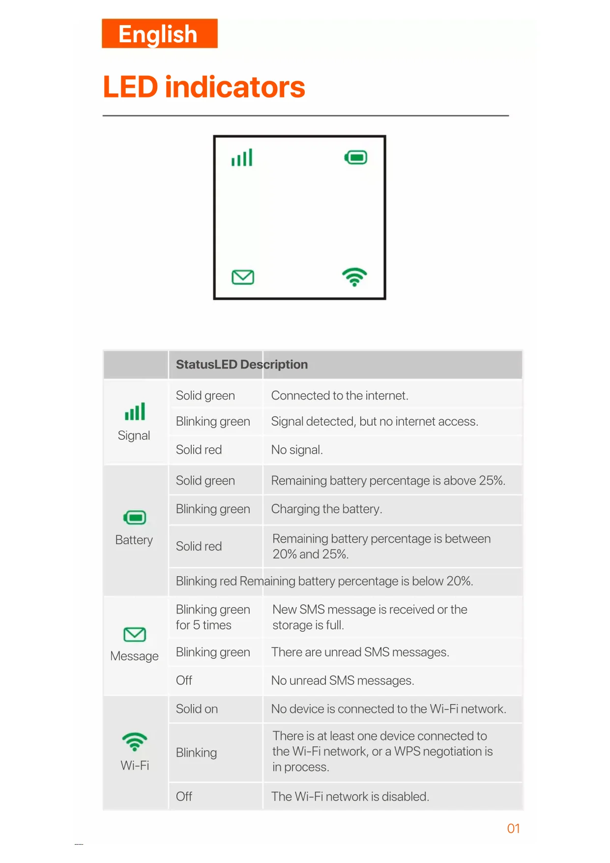 LED indicators StatusLED Description Solid green Blinking green Solid red Connected to the internet. Signal detected, but no internet access. No signal. Solid green Blinking green Solid red Remaining battery percentage is above 25%. Charging the battery. Blinking green for 5 times Blinking green Off There are unread SMS messages. No unread SMS messages. Solid on Blinking Off No device is connected to the Wi-Fi network. The Wi-Fi network is disabled. Blinking red Remaining battery percentage is below 20%. Signal Battery Message Wi-Fi Remaining battery percentage is between 20% and 25%. New SMS message is received or the storage is full. There is at least one device connected to the Wi-Fi network, or a WPS negotiation is in process.English