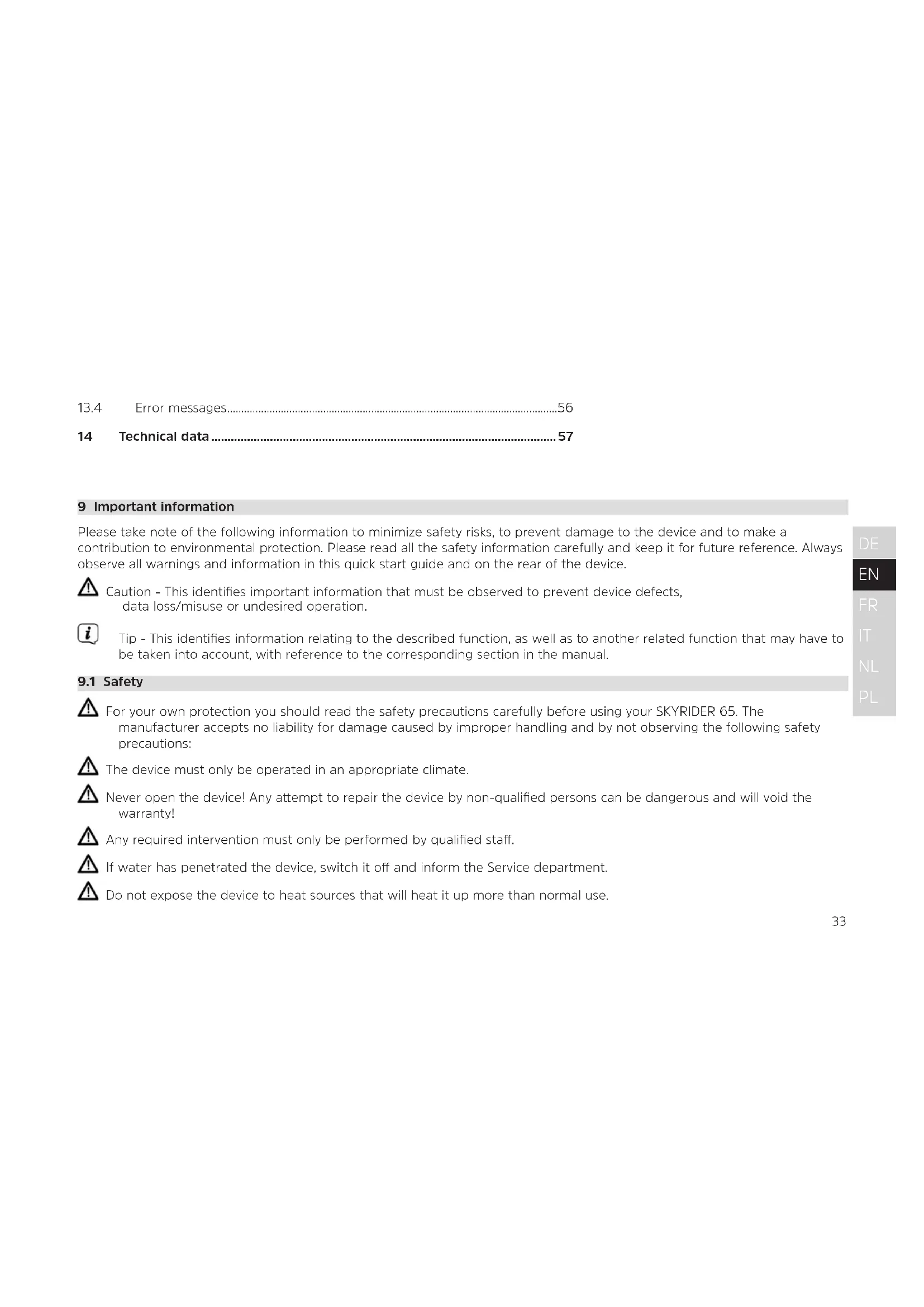 9 Important information Please take note of the following information to minimize safety risks, to prevent damage to the device and to make a contribution to environmental protection. Please read all the safety information carefully and keep it for future reference. Always observe all warnings and information in this quick start guide and on the rear of the device. Caution - This identifies important information that must be observed to prevent device defects, data loss/misuse or undesired operation. Tip - This identifies information relating to the described function, as well as to another related function that may have to be taken into account, with reference to the corresponding section in the manual.